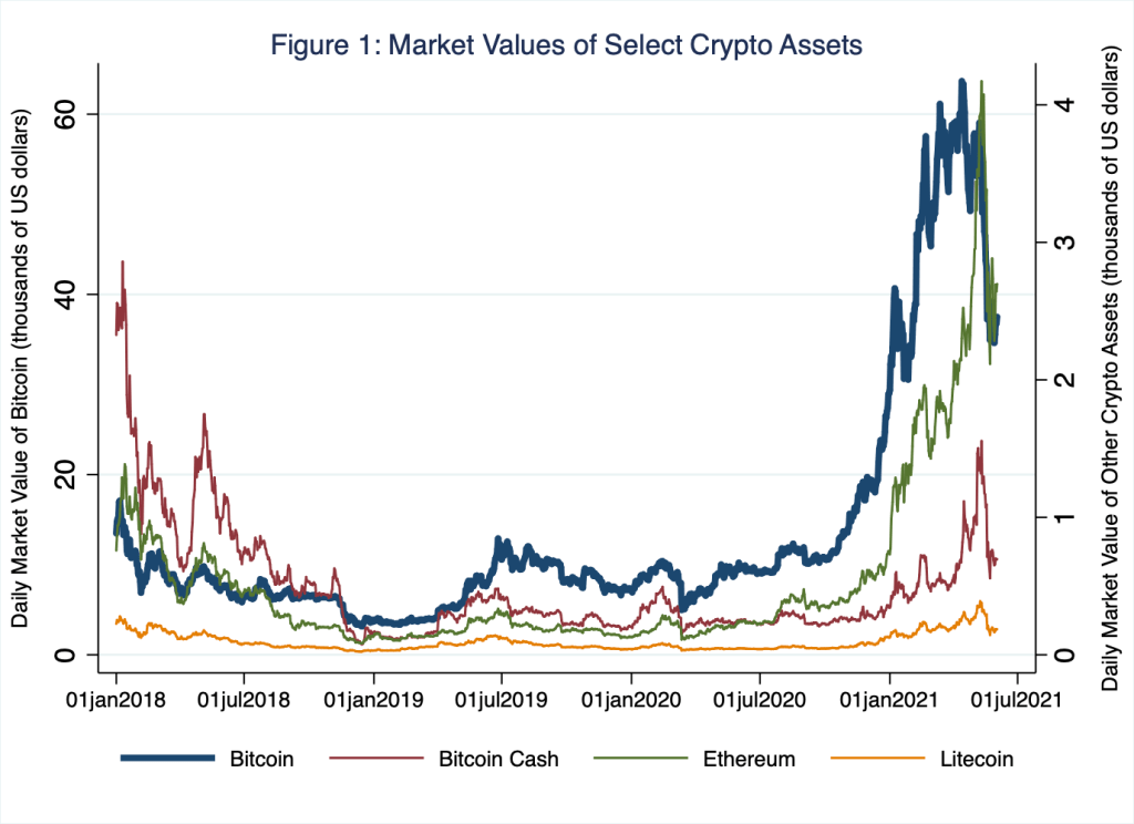 To be sure, crypto assets are having a moment. In Figure 1, I illustrate the daily market values of bitcoins and three other popular crypto-asset denominations in circulation; there are thousands of crypto-asset denominations in circulation.