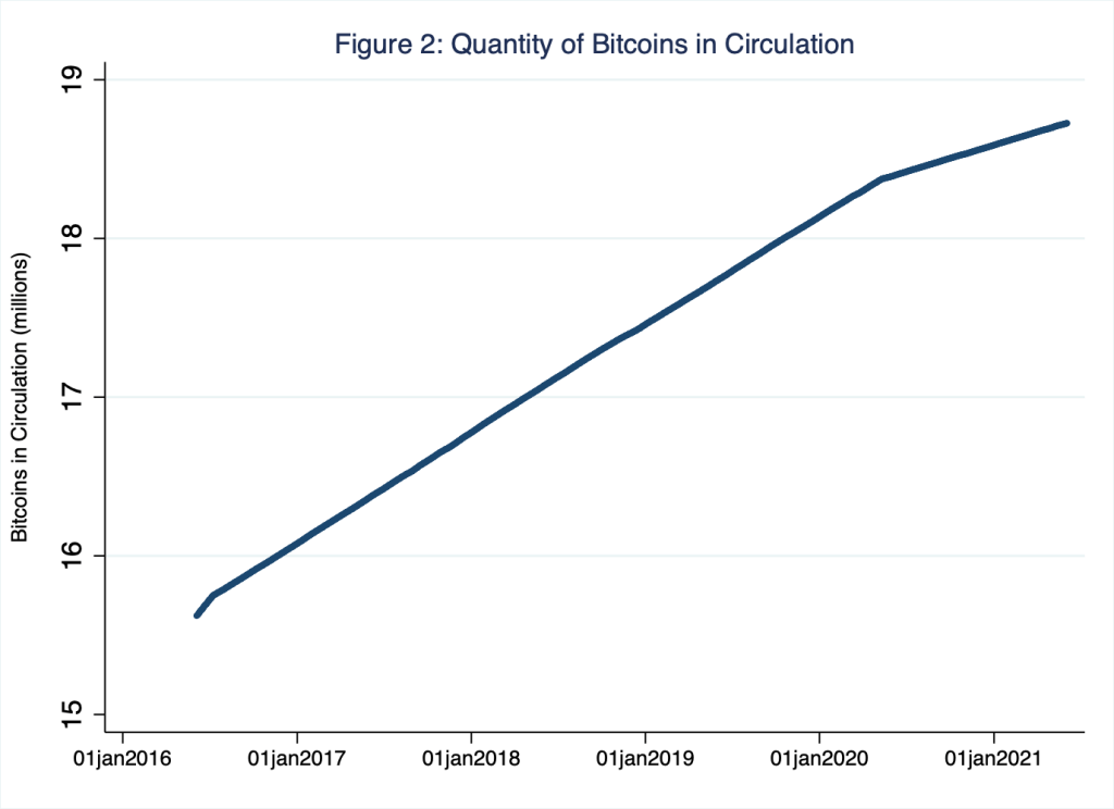 The smooth path in Figure 2 is not some statistical approximation; it’s the actual path of the quantity of bitcoins in circulation. In Figure 2, this path includes three (diminishing) growth rates—think, slopes in Figure 2—punctuated by two discrete changes in growth rates—think, kinks between the slopes in Figure 2. This deterministic pattern is the result of the mining process and protocols I described in the technical detour above: within the Bitcoin structure—its monetary policy, if you will—the difficulty of earning newly minted bitcoins changes over time so that earning a set amount of newly minted bitcoins—a set amount that halves every 210,000 authenticated blocks—requires a ten-minute search on average. For any fixed-slope segment in Figure 2, the amount of bitcoins earned (the rise of the slope) and the amount of time required to earn those bitcoins (the run of the slope) are fixed. Moreover, Bitcoin monetary policy dictates that the quantity of bitcoins in circulation is capped at 21 million (at which point the blue line in Figure 2 would appear perfectly flat).