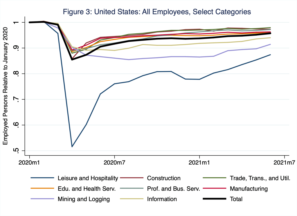 In the Table-1 column labeled “Category Loss,” I report the fall in employment levels across industries; Table 1 is related to Figure 3: that is, the category losses I report in column 2 of Table 1 are represented by the troughs I illustrate for select industries in Figure 3. To understand the remainder of Table 1, consider for example the leisure and hospitality industry. That industry’s employment loss of 49 percent (column 2) contributed 5 percentage points (column 3) to the total employment loss of 15 percentage points (column 3, last row) that the United States economy experienced suddenly in April 2020. Moreover, as of June 2021, that industry remains responsible for 10 percentage points (column 4) of the 30 percentage-points gap in employment (column 4, last row) the United State economy has yet to close. Finally, for the leisure and hospitality industry, the current gap consists of 2.1 million persons (column 5, which is in thousands) who once worked in the industry but have not returned (on net). For the economy as a whole, the gap consists of 6.8 million persons (column5, last row).