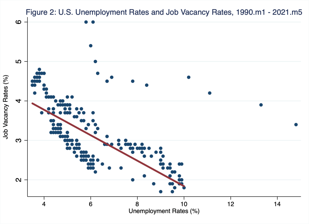 In Figure 2, I illustrate a UV (or Beveridge) curve for the United States between January 1990 and May 2021; each point in the figure represents a month (between January 1990 and May 2021) in the life of the United States labor market.