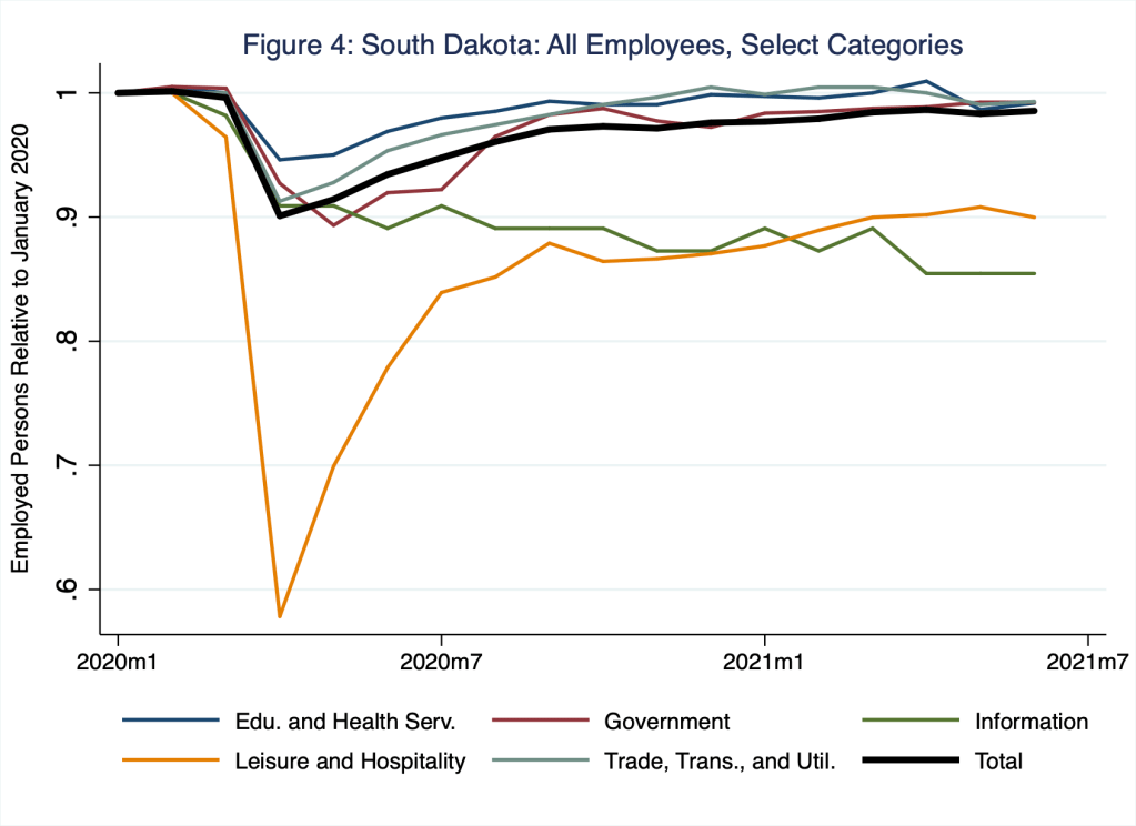 To understand more about the source of the current labor shortage around the country and, specifically, in South Dakota, consider how the pandemic affected labor markets. In Figure 3, I illustrate employment levels across industries in the United States and, for simplicity, I indicate employed persons in a given month relative to employed persons in January 2020; thus, in this figure, a vertical-axis reading of, say, .8 implies that the number of persons employed in that month equals 80 percent of the number of persons employed in January 2020.