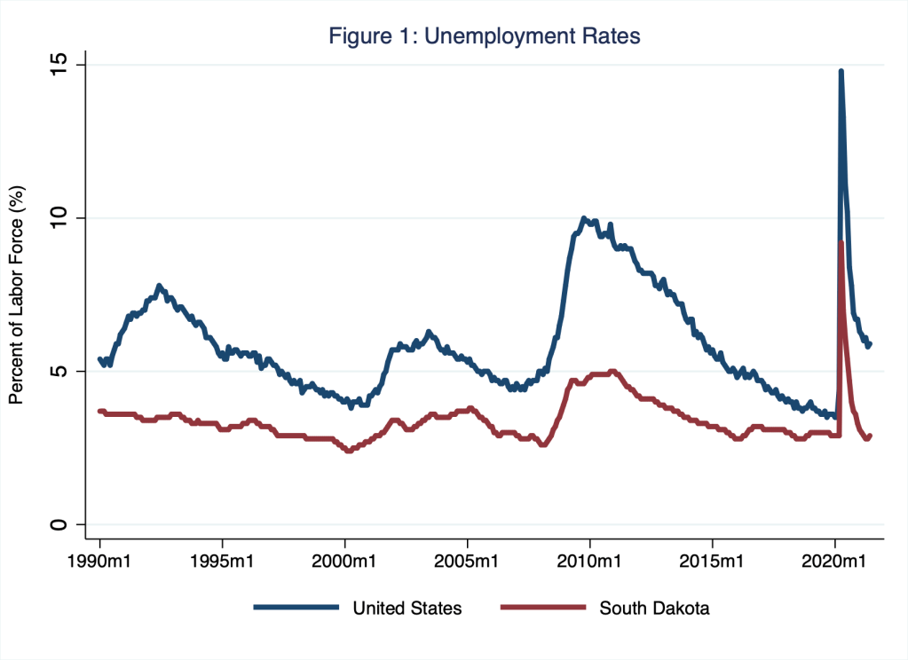 Since April 2020, national and regional unemployment rates have somewhat recovered; though, to be sure, the national unemployment rate remains elevated relative to its pre-pandemic levels. In any case, labor markets in the United States remain scarred. For example, although the pre-pandemic United States economy had been expanding for more than a decade and labor markets were commensurately tightening (because during an expansion, the number of persons available to fill job vacancies shrinks in relation to the number of job vacancies), the labor shortage we now experience—in South Dakota certainly, but elsewhere in the United States as well—is a sign that the process of matching persons with jobs, a process that requires search, has effectively suffered a negative productivity shock of some sort.