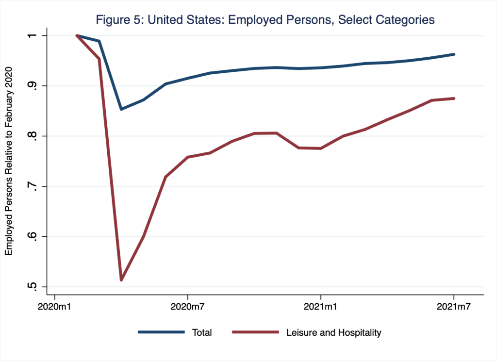 As Figures 1 and 2 illustrate, labor markets have tightened considerably since lockdown lifted; economic activity has recovered somewhat (Figure 3) and the demand for labor has increased accordingly. Meanwhile, the number of persons employed—think, labor supply—remains below the level the economy achieved just prior to the pandemic. For example, for the economy as a whole, 152.5 million persons were employed in February 2020 compared to 146.8 million persons employed now (as of July 2021), a gap of roughly 6 million persons; this employment gap quantifies the labor shortage that everyone is talking about. For the leisure and hospitality industry, which suffered the greatest loss in employment during lockdown, a gap of roughly 2 million persons remains. These patterns are visible in Figure 5, in which I illustrate employment levels for the economy as a whole (blue line) and for the leisure and hospitality industry (red line); for simplicity, I indicate employed persons in a given month relative to employed persons in February 2020. Thus, in this figure, a vertical-axis reading of, say, 0.88 (the most-recent observation for the leisure-and-hospitality industry) implies that the number of persons employed in that industry as of July 2021 equaled 88 percent of the number of persons employed in February 2020; thus, as of July 2021, an employment gap of 12 percent remained in that industry.