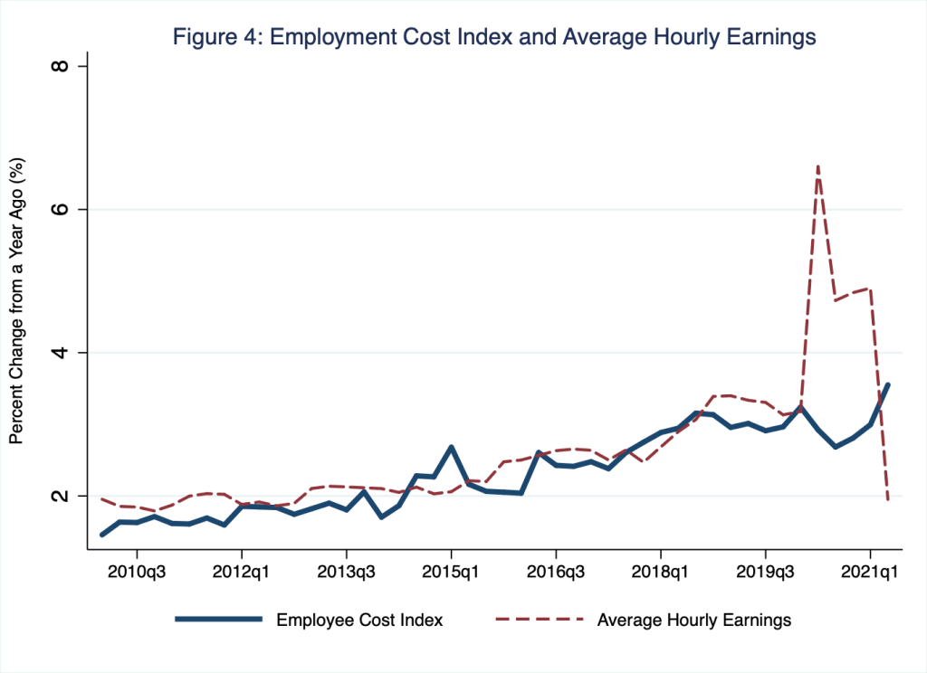 According to Figure 4, in the second quarter of 2020, when pandemic lockdown began, year-over-year growth in the employment-cost index (blue line) fell while growth in average hourly earnings (red dashed line) rose dramatically. This is because, in response to lockdown, the demand for labor generally fell, particularly in industries that produced services—not goods, as a practical matter—most vulnerable to the risks of exposure to COVID-19; think, for example, the leisure and hospitality industry. Coincidentally, wages in industries such as leisure and hospitality (and other industries that are similarly vulnerable to the risks of exposure to COVID-19), tend to be relatively low. Thus, as workers who earned below-average wages lost their jobs in disproportionately large numbers during lockdown, average hourly earnings rose (because workers who earned above-average wages kept their jobs in disproportionately large numbers). Nevertheless, lockdown diminished wage pressures, a fact that is evident from the fall in year-over-year growth in the employment-cost index. Bottomline, in the quarter in which lockdown began, labor markets loosened because the demand for labor fell; consequently, the growth of wages slowed.