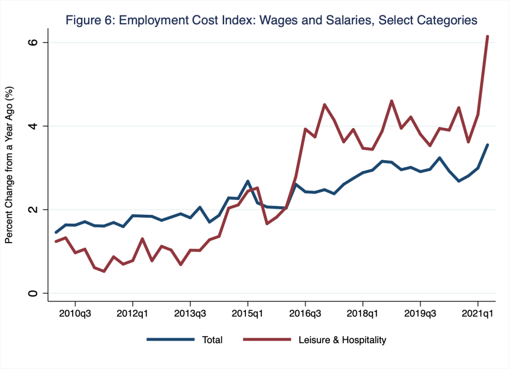 According to Figure 6, year-over-year growth in the employment-cost index for the economy as a whole (blue line) registered a relatively high rate of 3.6 percent in the second quarter of 2021. Meanwhile, year-over-year growth in the employment-cost index for the leisure-and-hospitality industry (red line) registered an astoundingly high rate of 6.1 percent in the second quarter of 2021. In Table 1, I report, for all BLS private-employment categories, employment gaps as of 2021 Q2 and year-over-year growth in the employment-cost index for wages and salaries.