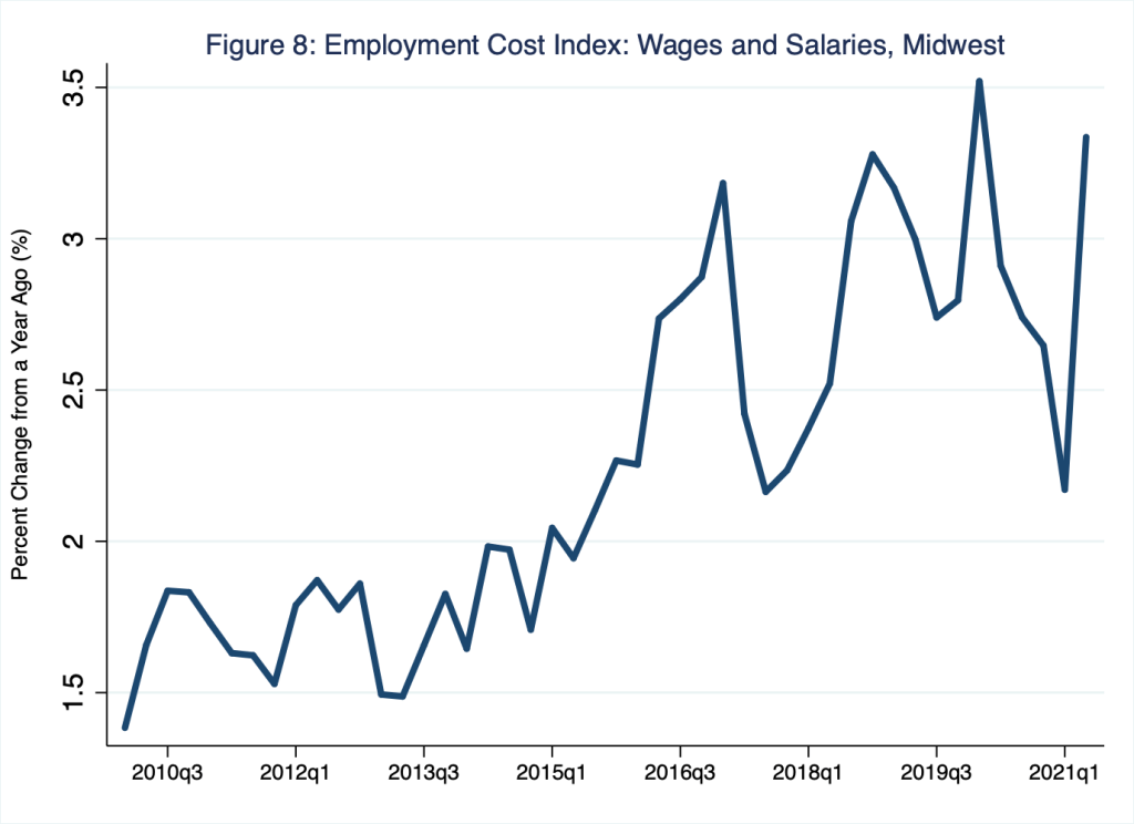 Indeed, these wage pressures are evident in the regional economy, as well. Employment-cost indices are not available for individual states. However, these data are available for United States census regions, including the Midwest census region, to which South Dakota belongs. In Figure 8, I illustrate year-over-year growth in the employment-cost index for wages and salaries for private industry in the Midwest census region.
