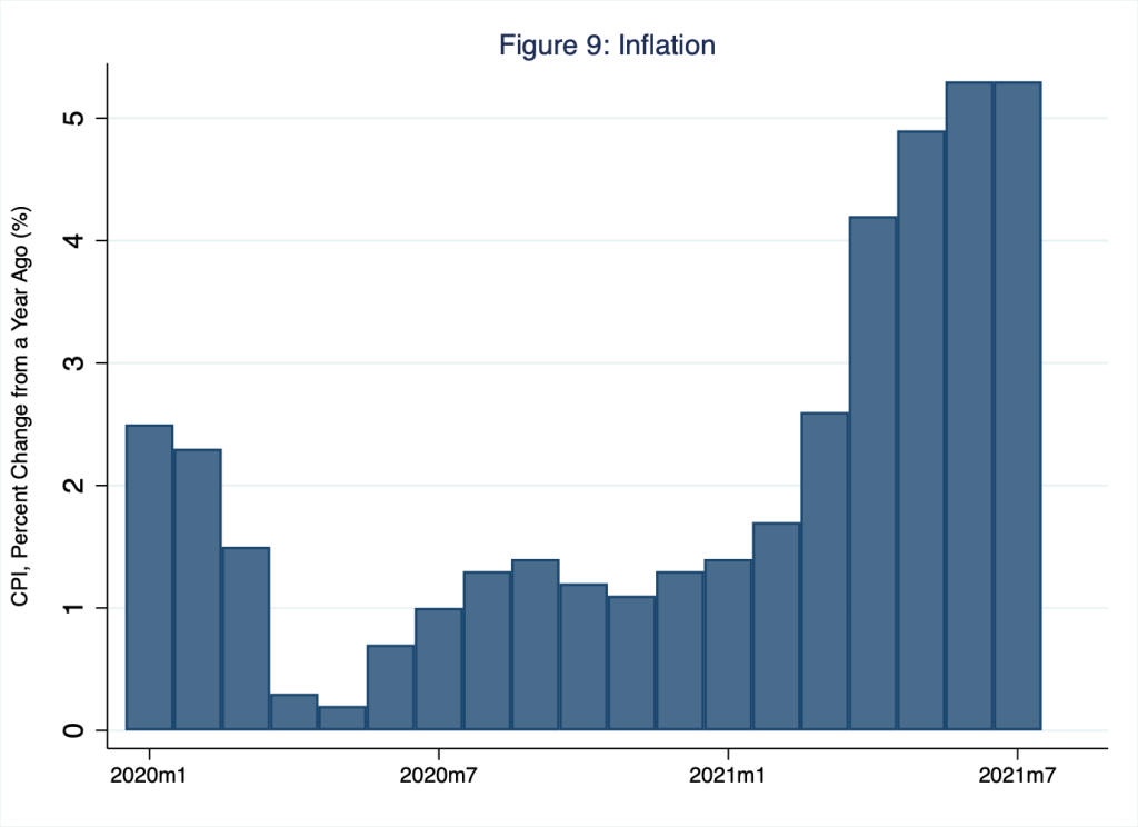 Wage gains are not necessarily purchasing-power gains. This is to say, because the average price level generally rises over time, the purchasing power of so-called nominal wage gains—gains in terms of dollars, as opposed to gains in terms of the goods and services that dollars buy—is eroded by the rate of inflation. For the last several months, the rate of inflation has registered year-over-year values in the range of 5 percent. For example, in Figure 9, I illustrate inflation as measured by the year-over-year percentage change in the consumer price index.