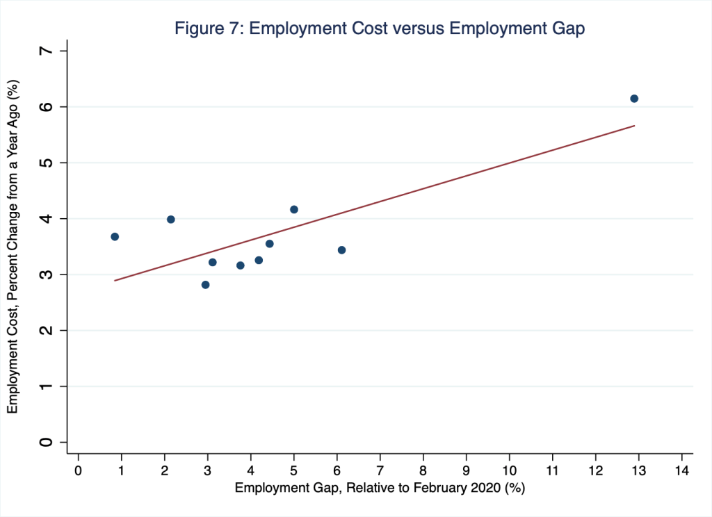 The points in Figure 7 correspond to the information across the rows in Table 1. Thus, for example, the observation in the far right corner of Figure 7 corresponds to the information in the row labeled, “Leisure and Hospitality” in Table 1, where the employment-gap entry is 12.9 percent and the employment-cost entry is 6.1 percent. Figure 7 suggests what microeconomic theory implies: wage pressures vary across industries based on industry-specific forces of demand and supply; and, perhaps most importantly, current wage pressures are greatest in those industries in which the employment gaps are greatest.