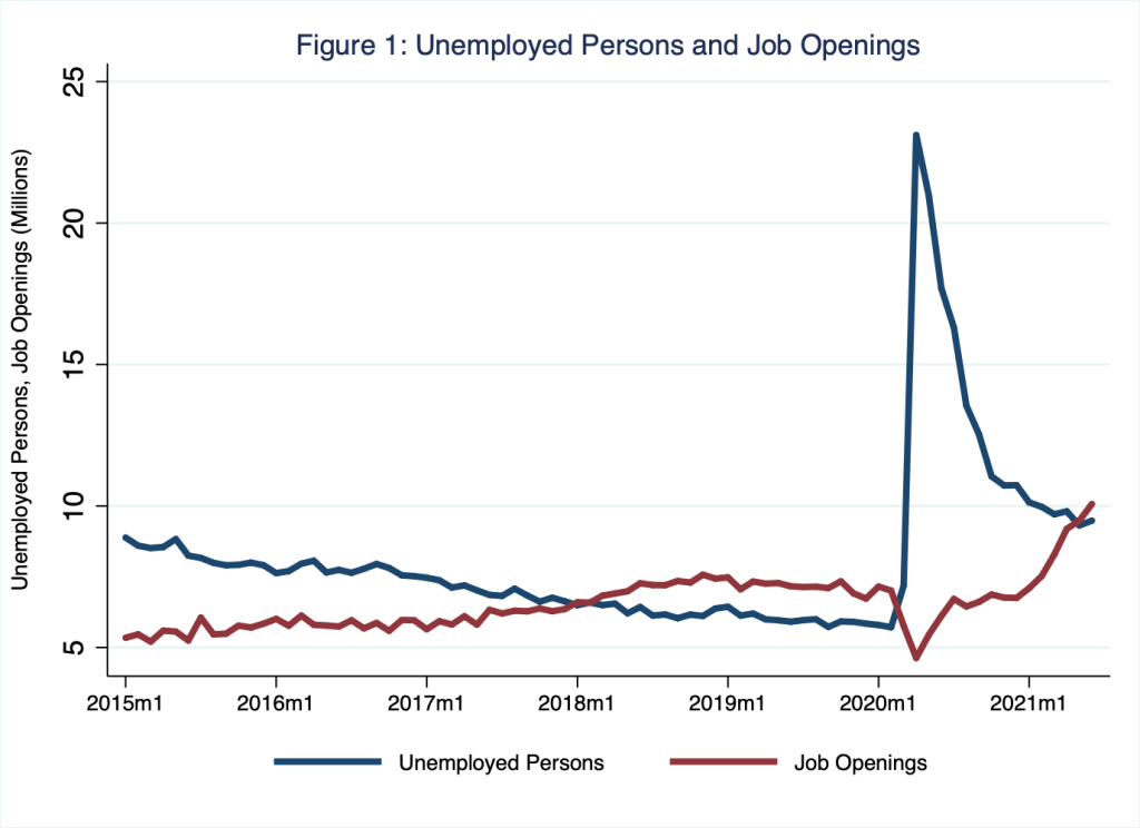 Last Friday, September 3, the United States Bureau of Labor Statistics (BLS) reported that, in August, the number of employed persons grew by 235,000, while the nation’s unemployment rate fell to 5.2 percent. The report was a big disappointment: economists had expected the number of employed persons to grow by something closer to 1 million, just as this measure of payroll growth had done in June and July of this year. Clearly, the macroeconomic effects of and the policy responses to the pandemic have scarred labor markets in the United States. Moreover, on balance, the challenge seems to be one of generating labor supply—think, there are not enough employees to fill open positions—rather than one of generating labor demand. As I illustrate in Figure 1, the number of job openings (in red) in the United States has exceeded the number of unemployed persons (in blue) since May 2021.