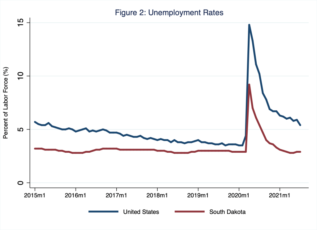 This difference between the number of job openings and the number of unemployed persons is a reliable, albeit broad, measure of aggregate labor-market conditions. As Figure 1 demonstrates, the number of job openings rose above the number unemployed persons as the United States economy neared the end of its decade-long business-cycle expansion in 2018. The measure then dramatically reversed course during the pandemic lockdown, when the demand for labor suddenly and dramatically decreased, before returning to its pre-pandemic pattern. This recent tightness in the (still-scarred) labor market is also evident from unemployment rates, which I illustrate in Figure 2. Indeed, the labor market in South Dakota, where the unemployment rate for July registered 2.7 percent, signals something very close to full employment.