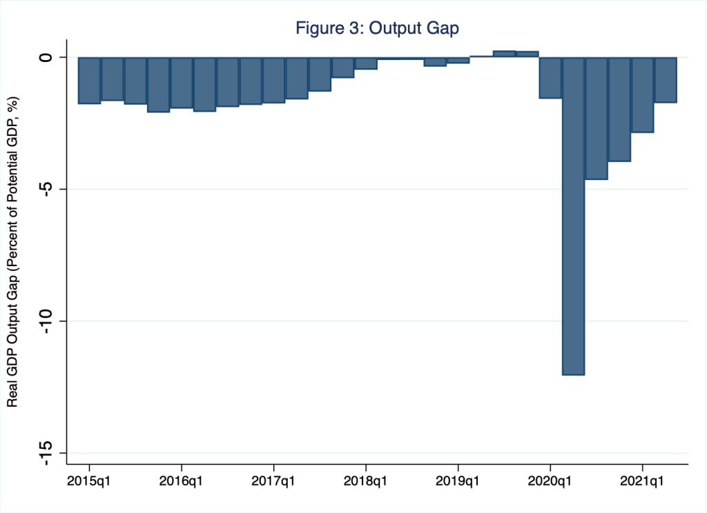 As I discussed in a recent Schooled post (In Search of a Beveridge), labor markets are tight in part because, since the pandemic began, many circumstances have conspired to increase job-search time and effort among jobseekers. The most obvious of these is the pandemic itself; some jobseekers may wish to avoid the types of employment that might increase risks of exposure to COVID-19 and its variants. Meanwhile, some jobseekers may have prolonged their search in order to match more appropriately their skills and preferences to job vacancies, found their search efforts hampered by demands at home or disrupted by sectoral and geographical shifts of labor demand, or deemphasized the need to search because of extended and augmented unemployment-insurance benefits. Finally, some (former) jobseekers may have permanently left the labor force for reasons related directly or indirectly to the pandemic; think, for example, accelerated retirements. In any case, the United States economy continues to recover and, in doing so, close its output gap, the difference between economic output in a given quarter compared to economic output the economy would have achieved if it were operating at full capacity—or, as economists like to say, operating at potential; and, yes, potential output is a counterfactual estimate, a well-educated guess. In Figure 3, I illustrate the output gap.