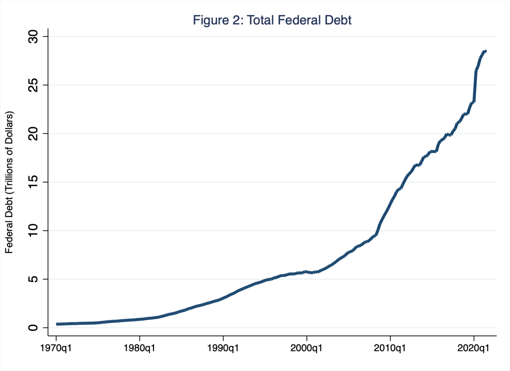 According to Figure 2, like its debt-to-GDP counterpart measure (Figure 1), the U.S. national debt has generally grown since 1970; the large, seemingly discontinuous vertical rise in 2020 is hard to miss. As of the third quarter of 2021, the national debt registered roughly $28 trillion, the last data point illustrated in Figure 2.