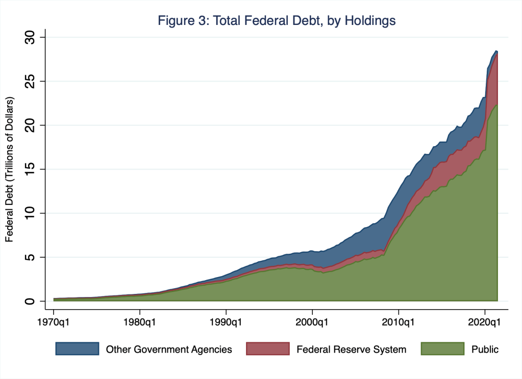 The U.S. Treasury securities that comprise the national debt are owned by the (non-U.S. governmental) public—domestic and foreign—and U.S. national government agencies. In Figure 3, I illustrate the broad composition of such debt holders, which I identify as either the (non-U.S. governmental) public, the Federal Reserve System, or other government agencies.
