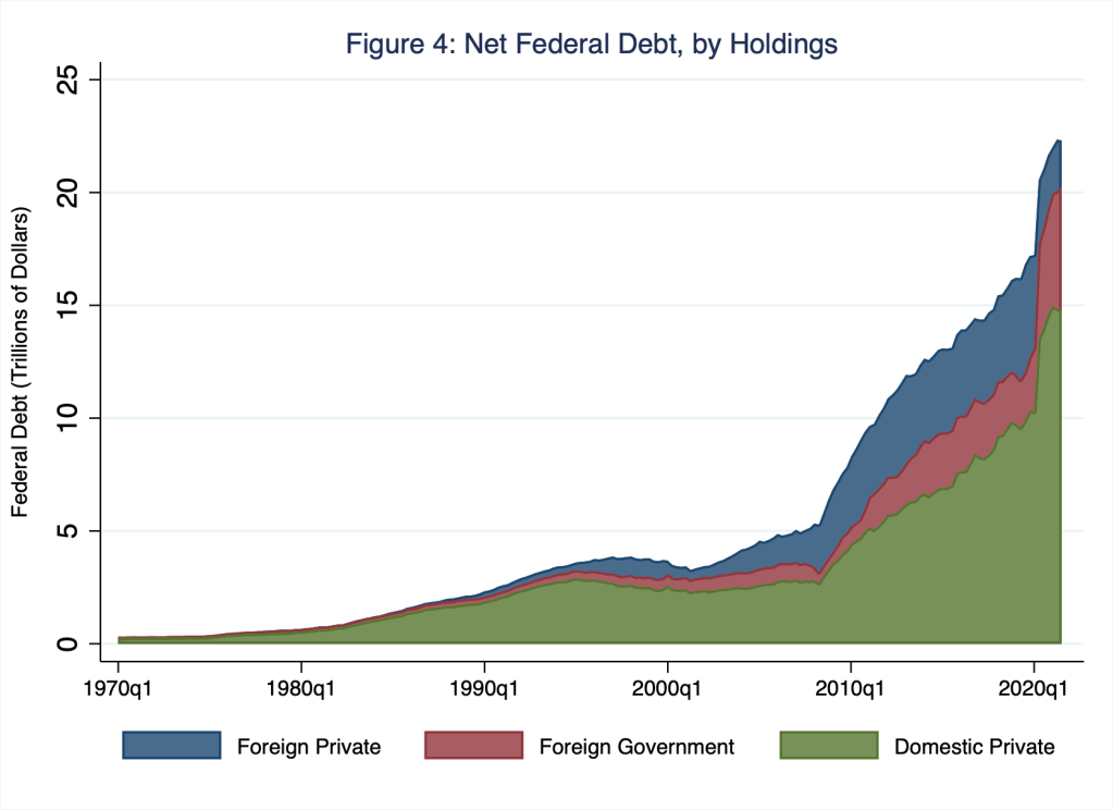 For any quarter in Figure 3, the sum of green, red, and blue areas equals the national debt—$28 trillion in the third quarter of 2021, for example. In general, the Federal Reserve System (red area) purchases and sells U.S. Treasury securities to implement the central bank’s monetary policy. Since the financial crisis, the central bank has been exceptionally active in this way: so-called quantitative easing—purchasing large quantities of financial assets, including U.S. Treasury securities to a very large extent—in response to the financial crisis around 2009 and, more recently, in response to the macroeconomic contraction imposed by the pandemic has raised rather dramatically the share of U.S. Treasury securities held by the Federal Reserve System—roughly $6 trillion as of the third quarter of 2021, according to Figure 3. Other government agencies (blue area)—think, for example, the Social Security Administration, which invests its surpluses in U.S. Treasury securities—held roughly $200 billion of U.S. Treasury securities. Finally, the public (green area)—that is, non-U.S. governmental entities, domestic or foreign—held the very-large remainder of roughly $22 trillion of U.S. Treasury securities. As a practical matter, these $22 trillion of publicly traded U.S. Treasury securities constitute the current secondary market for U.S. sovereign debt. As I illustrate in Figure 4, the holders of these securities include mostly domestic private investors (green area; roughly $15 trillion), as well as foreign governments (red area; roughly $5 trillion) and foreign private investors (blue area; roughly $2 trillion).
