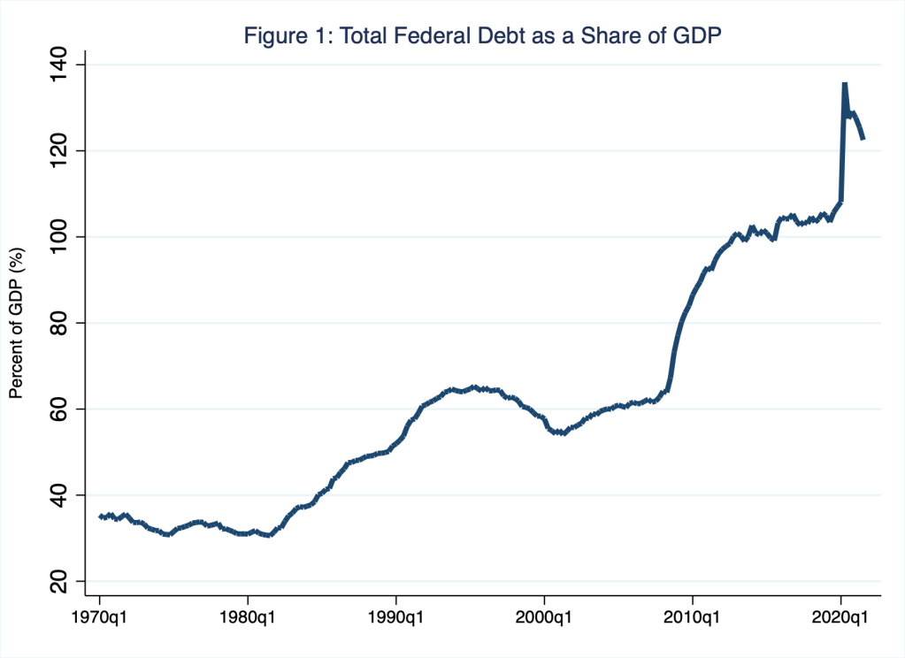 Figure 1 is familiar to Schooled readers who have read my analysis of whether the U.S. debt-to-GDP ratio is sustainable—spoiler alert: it’s not. (For more on the sustainability of the U.S. national debt and the U.S. government’s fiscal space to borrow even more, see Monday Macro segments, Fiscal Therapy and C-B-UH-OH.) The story of Figure 1 is well worn: since 1970, the U.S. national debt as a percentage of GDP rose from roughly 40 percent in 1970 to roughly 123 percent in the third quarter of 2021; the corresponding ratios for the U.S. national debt held by the public—that is, netting out the portion of the outstanding national debt that is owed to national-government agencies—are 27 percent and 96 percent, respectively. To be sure, the U.S. national debt is relatively large by either measure. The rather discontinuous and large increases in the debt-to-GDP ratio around 2009 and, again, in 2020 were driven by the large increases in deficit spending at those times, as well as large—or, more precisely in the case of 2020, enormous—decreases in GDP, a mechanical increase in the ratio caused by a fall in its denominator.