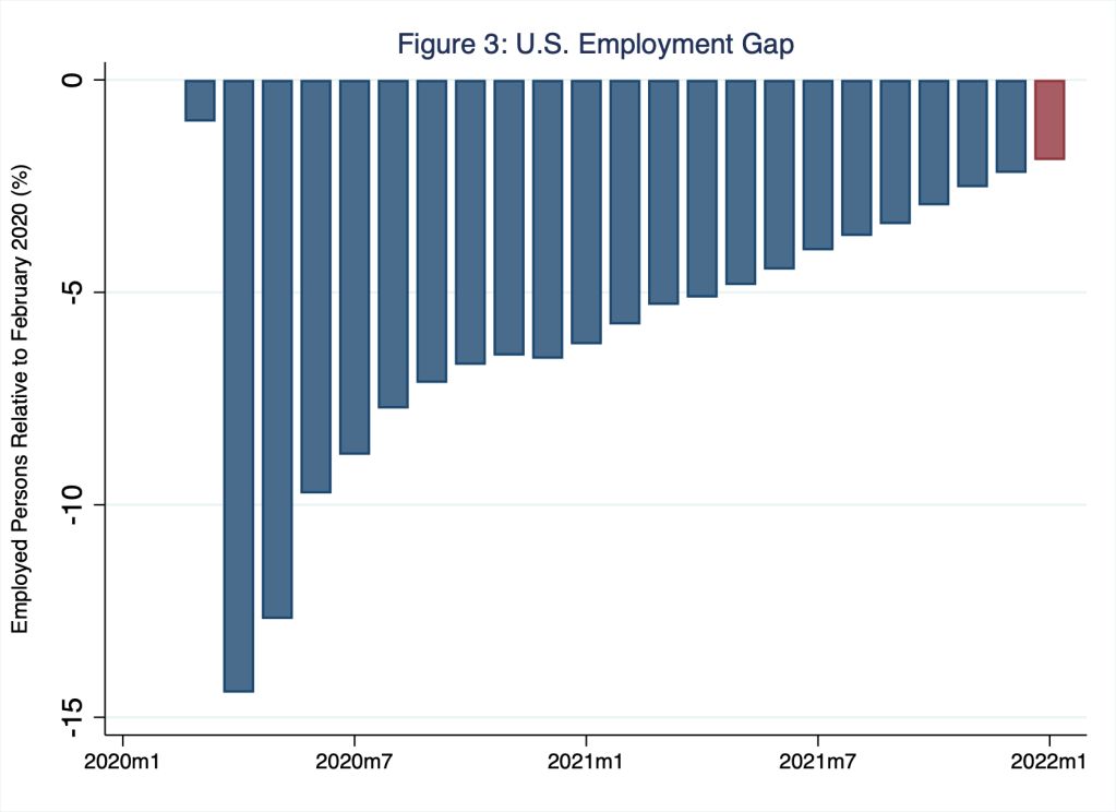 Thus, the pandemic initially idled a relatively large share of the labor force, leaving a plentiful (excess) supply of human resources that might have discouraged firms from investing in labor-saving automation had such conditions persisted. However, such conditions did not persist, of course. Rather, as I also illustrate in Figures 1 and 2, U.S. labor markets tightened relatively quickly. By early 2021, conditions of excess supply turned to conditions of excess demand: the number of unemployed persons fell below the number of job openings (Figure 1), while the unemployment rate soon satisfied any reasonable macroeconomic definition of full employment (Figure 2). As of January 2022, jobs outnumbered available workers and the labor force was effectively fully employed, even though the number of persons employed in the U.S. remained below the number of persons employed in February 2020, around the time the pandemic was officially detected in the U.S. In Figure 3, I illustrate this pattern: as of January 2022, the employment gap, relative to the number of persons employed in February 2020, remained at negative 1.9 percent, or roughly 2.9 million (missing) persons.