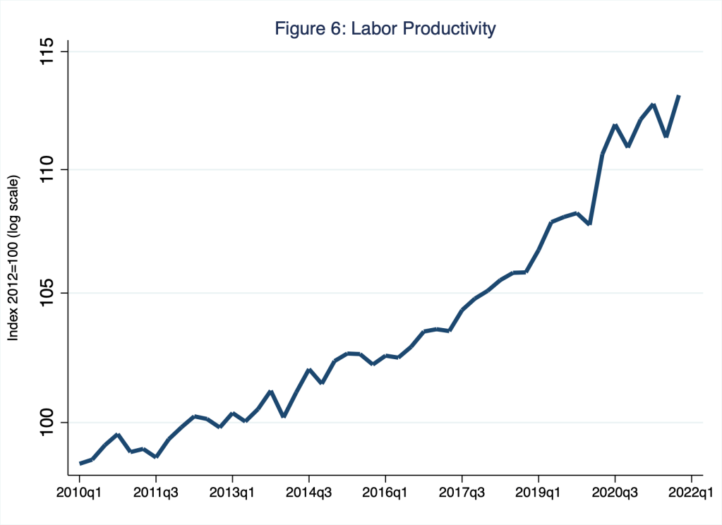 A corollary of this analysis is that even if technological innovation were to destroy jobs on net—and it very likely does not—such innovation would nevertheless necessarily increase labor productivity. This general pattern is apparent in Figure 6, in which I illustrate labor productivity (as an index normed in 2012) during the pandemic, when labor’s share of capital and technology effectively rose and, with it, labor productivity effectively rose as well.