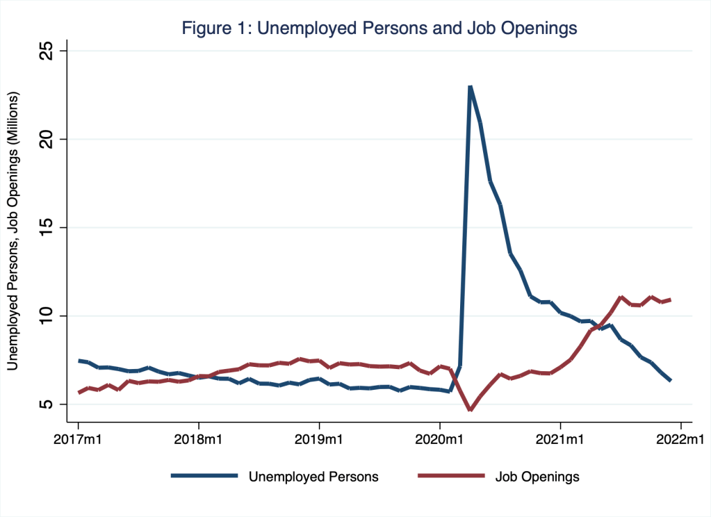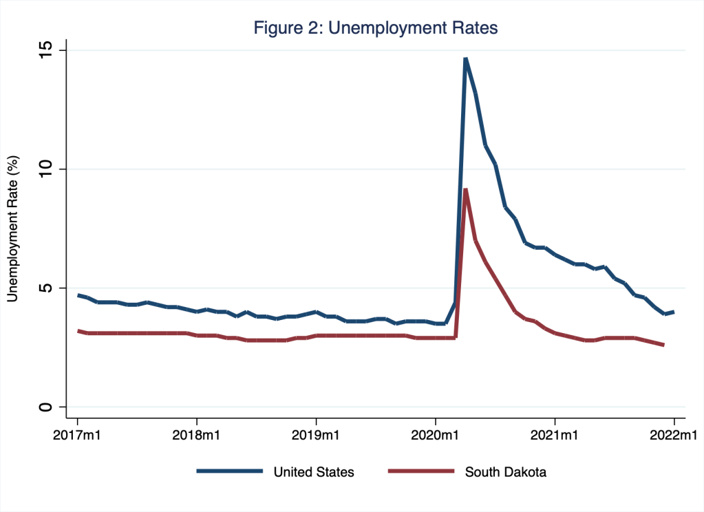 To be sure, since long before the pandemic, economists have studied the effects of automation on labor markets. Ironically, we would be forgiven for thinking the pandemic initially quelled rather than stirred interest in this topic; lockdowns and repressed demand for goods and services rendered labor plentiful: no need for robots when labor is desperately seeking work. As I illustrate in Figure 1, in the early months of the pandemic in the U.S., the number of unemployed persons rose dramatically by roughly 20 million, while the number of job openings fell. Consequently, as I illustrate in Figure 2, the unemployment rate rose dramatically in the nation and in South Dakota—home to Schooled and Monday Macro.