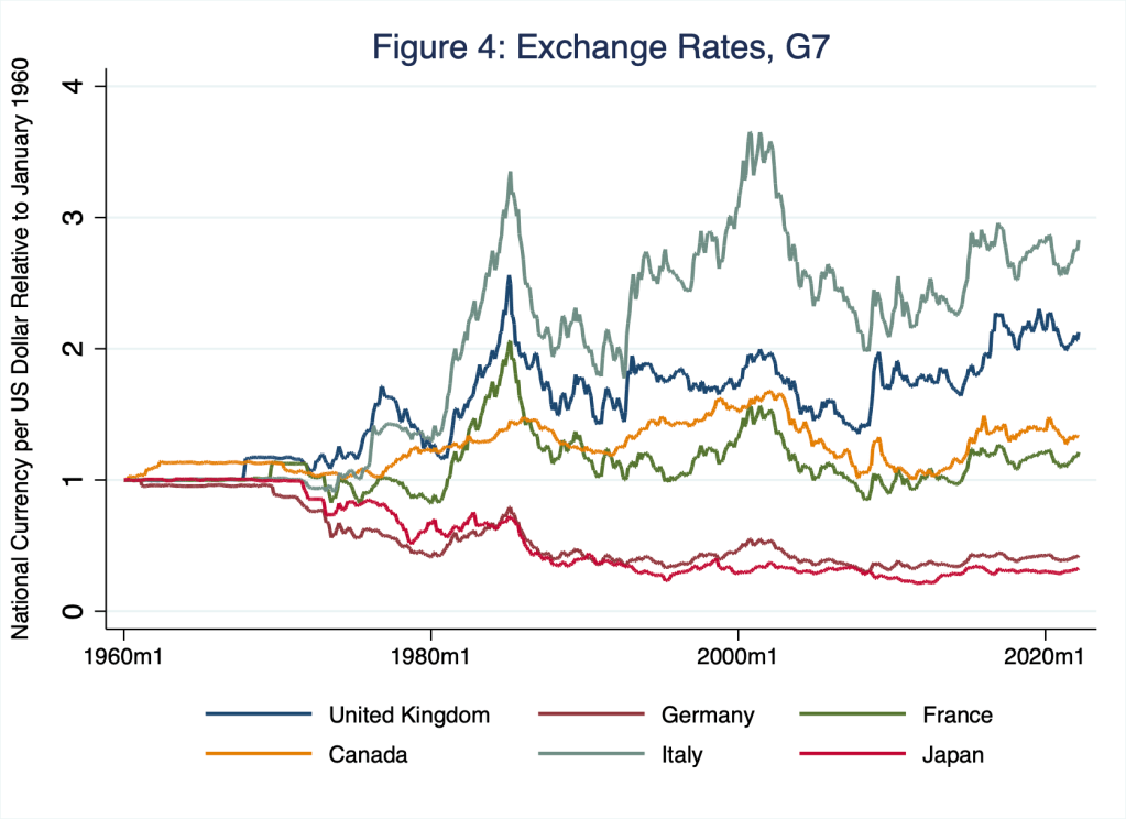 First, on August 15, 1971, at the end of a highly secretive three-day meeting at Camp David, President Richard Nixon effectively ended the U.S. dollar’s convertibility to gold; for an intriguing analysis of the three-day meeting and its aftermath, see Garten (2021). From 1944 until that day in August 1971, the Bretton Woods System prevailed: the system linked the U.S. dollar to gold at a fixed rate of $35 an ounce and the system linked other currencies, most notably those of the other G7 countries, to the U.S. dollar at fixed rates. Thus, by 1973—after failed attempts by the U.S. government and its international counterparts to restart a fixed-exchange rate system linked to gold—the end of the Bretton Woods System ushered in a modern flexible-exchange rate, fiat-money system. From that point forward, money effectively lost the intrinsic value it had when it was convertible into gold. (For more on exchange rates, see the Morning Macro segment, “A Tale of Two Currencies.”) In Figure 4, I illustrate the nominal exchange rates of the G7 countries with the U.S. dollar as the base currency (so the figure includes six as opposed to seven exchange rates, each relative to the dollar).