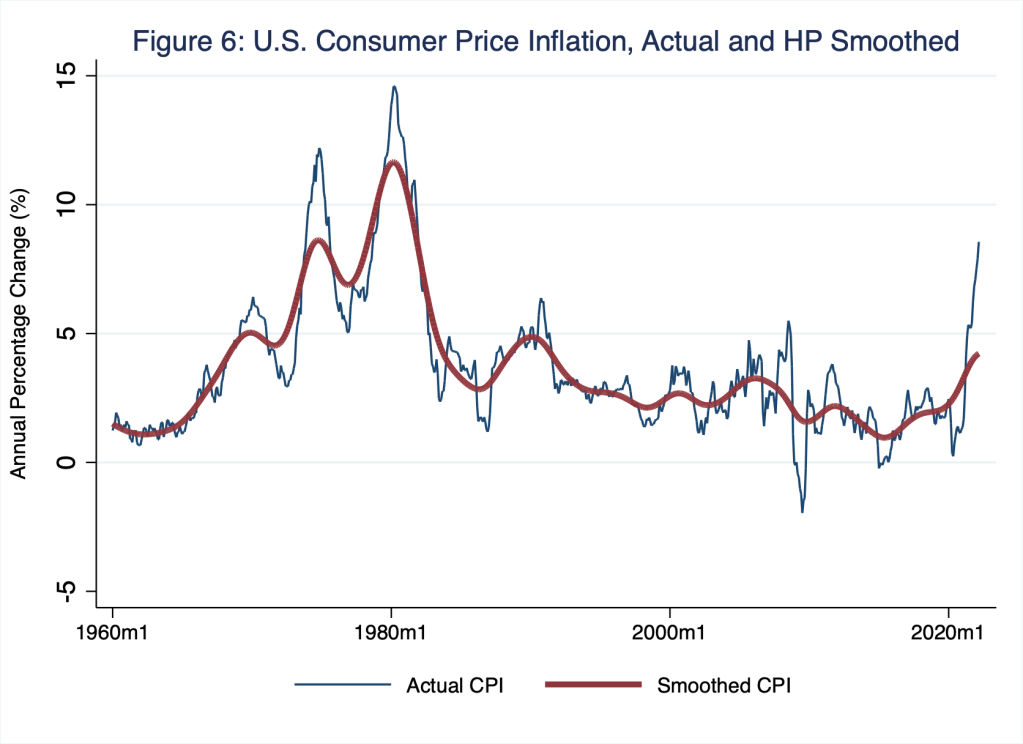 According to Figure 5, for several quarters during the 1970s, the output gap was substantially positive, implying the U.S. economy was overheating, as it were, because macroeconomic policy in general—and monetary policy in particular—was inappropriately loose. By contrast, if the current output gap is to be believed (because these data are as yet unrevised), the current U.S. economy is not in the overheated state it was in during the 1970s. Indeed, trend price pressures, which I illustrate in Figure 6 (in red), remain lower today than in the 1970s, suggesting that inflationary pressures have not reached the level or breadth that such pressures reached in the 1970s; though, admittedly, given the recent rise in this trend, this pattern is hardly consoling.