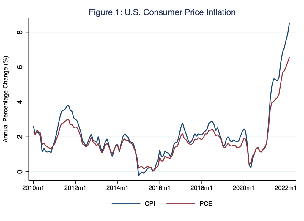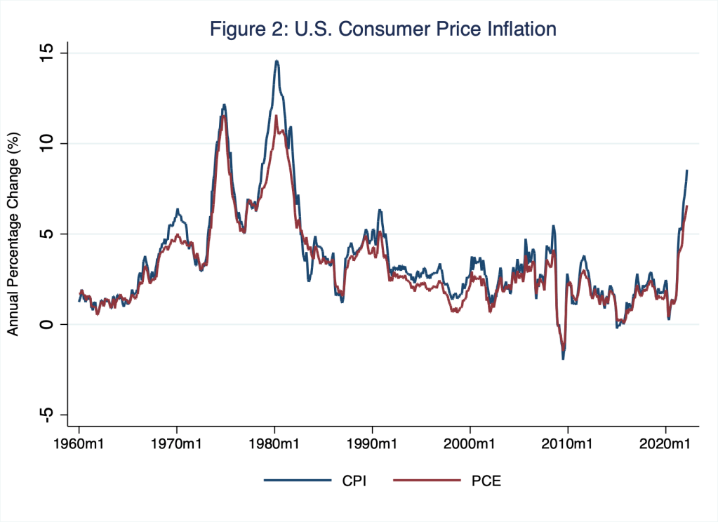 Empirically speaking, now may be too soon to know if the comparison is valid. Elevated rates of inflation in the U.S. since COVID have persisted for (only) about a year; whereas the Great Inflation persisted for the better part of a decade. Nevertheless, current rates of inflation are disturbingly high. As I illustrate in Figure 1, the year-over-year inflation rate based on either the consumer price index (CPI) or the personal consumption expenditures (PCE) index now registers above 6 percent: in March 2022, CPI inflation registered 8.6 percent, while PCE inflation, a measure the Federal Reserve prefers, registered 6.6 percent.
