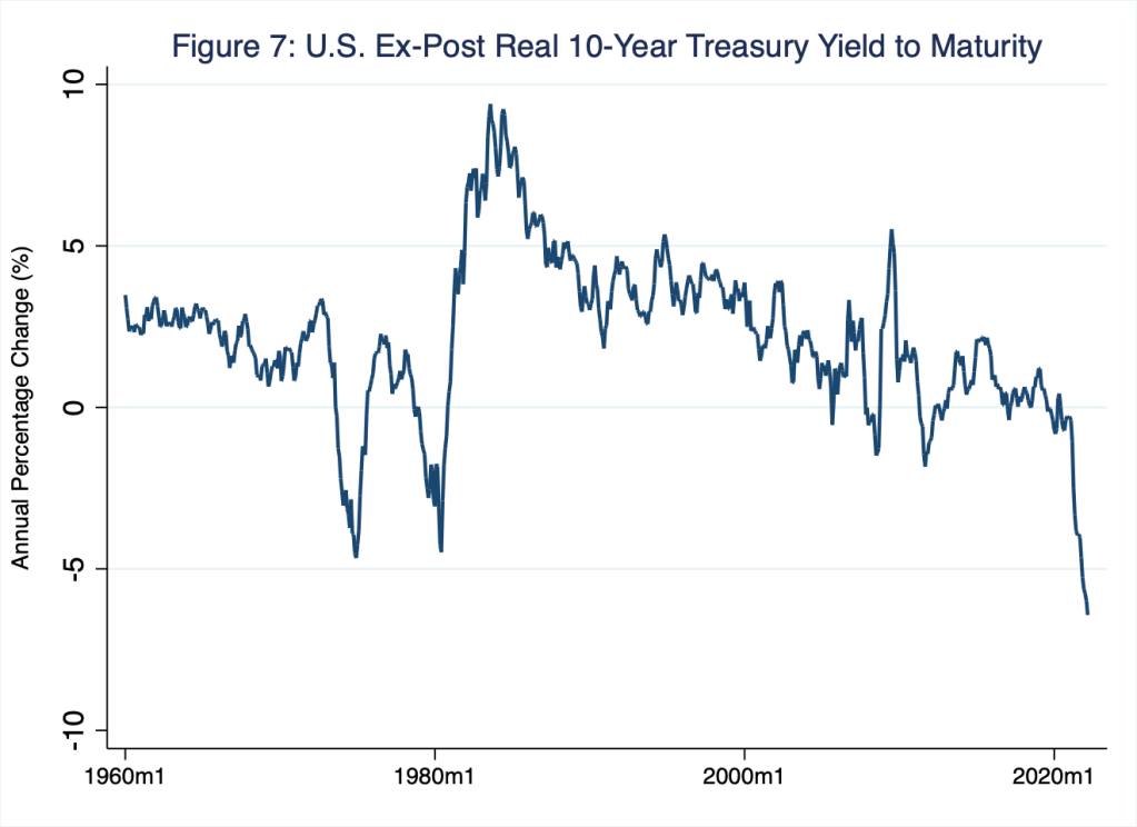 Third, the current 10-year inflation-adjusted (or real) Treasury yield to maturity is substantially negative, much as it was during the Great Inflation. However, the current real interest rate is larger (in absolute value) than it was at any time during the Great Inflation. In Figure 7, I illustrate this pattern.