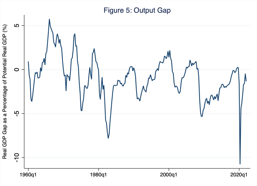 Second, the Federal Reserve entered the 1970s in the final heydays of Keynesian macroeconomic stabilization policy based on the intellectual norm that a so-called Phillips curve—a trade-off between the unemployment rate and the inflation rate—existed and could be exploited by managing aggregate demand policy: ostensibly, policymakers thought they could essentially choose an unemployment rate and an inflation rate by simply managing aggregate demand accordingly. (For more on the Phillips Curve and its implications for macroeconomic policy, see the Morning Macro segment, “Revolutions.”) Of course, policymakers assumed they would stimulate the economy to full employment, but not beyond it—where, by definition, higher inflation lurks. The problem, then as now, is knowing where economic output is relative to full employment. Economic research on the Great Inflation suggests that monetary policymakers at the time systematically underestimated full employment; see, for example, Orphanides (2003). Thus, throughout the 1970s, the Federal Reserve maintained—unknowingly, to some extent—a policy that was too loose for too long. In Figure 5, I illustrate this difference between actual output and its full-employment level, or what economists call the output gap.