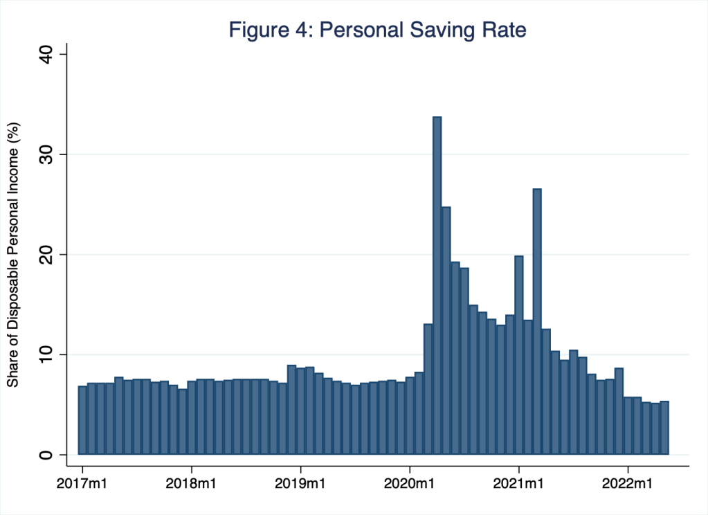 Nevertheless, at this point in the central bank’s war on inflation, the negative effects of monetary contraction on households are somewhat less apparent than we would expect all else equal. This is because for much of 2020 and 2021, all else was not equal: on the contrary, the personal saving rate was exceptionally high for a time, thus buttressing household balance sheets in ways that have, to some extent, allowed households to withstand the current high inflation and monetary contraction. In Figure 4, I illustrate the personal saving rate, which measures the share of household disposable income that households save each month.