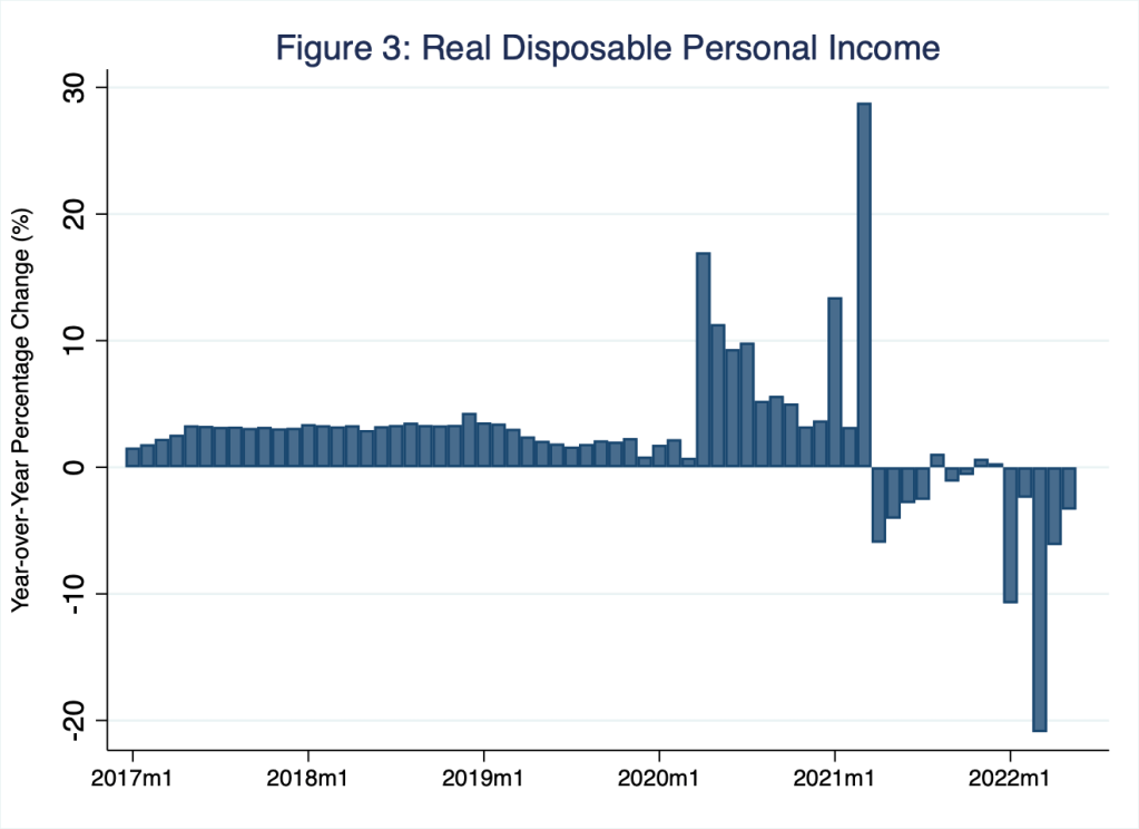 There is some evidence that the current round of monetary tightening is working. Though this evidence is rather indirect and, as one might expect from the dismal science, rather dismal. This is to say, while the rate of inflation remains elevated, economic output, broadly defined and measured, seems to be undergoing the sort of pain consistent with tighter monetary policy. So good news, the pain required to establish price stability is increasingly evident; we don’t call it the dismal science for nothing. In Figure 3, I illustrate the year-over-year percentage change in disposable personal income adjusted for inflation; we could think of positive [negative] growth in this measure—a bar rising [falling] above zero in Figure 3—as households’ budgets rising [falling], affording households the opportunity to consume more [fewer] goods and services with a given level of disposable personal income.