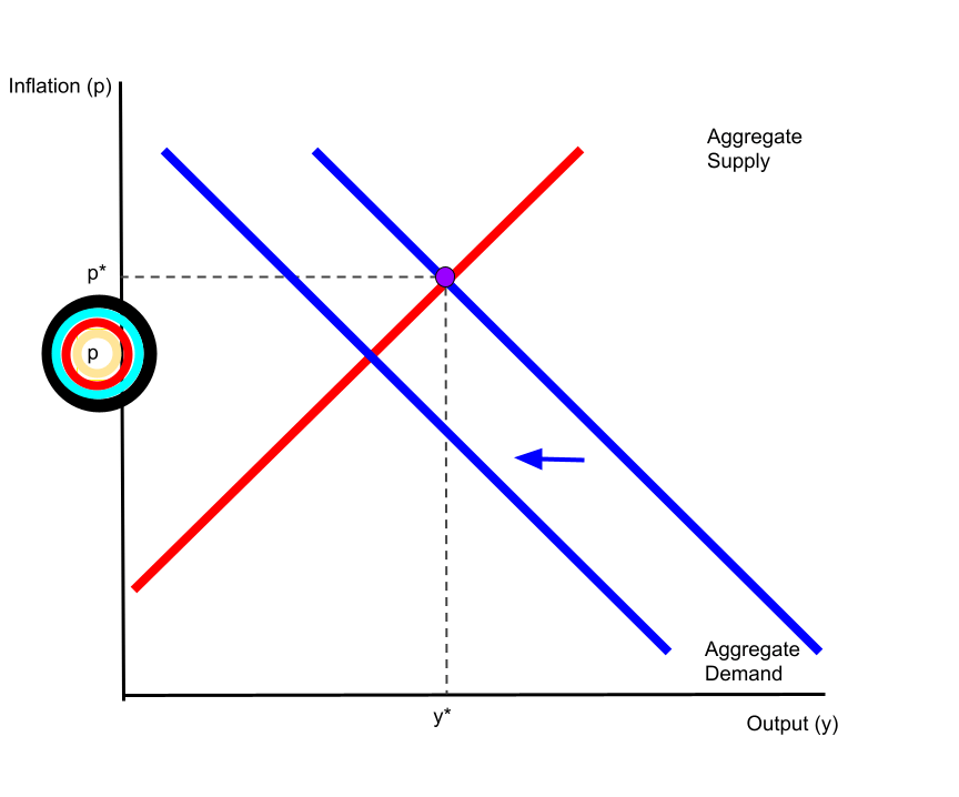 No matter the cause of the high inflation, the instruments of macroeconomic policies, which include monetary and fiscal policies, affect aggregate demand, only. We could think of aggregate demand more concretely as the total amount of expenditures demanded by all sectors of the economy: namely, households, firms, governments, and foreign buyers of our goods and services. In Illustration 1, I demonstrate how macroeconomic stabilization policy—think, contractionary monetary policy instigated by an intentional rise in the short-term interest rate—shifts the aggregate demand curve to the left, causing the rate of inflation to fall from p* to its target—the bullseye pictured in the illustration—and causing the level of economic output to fall from y*.