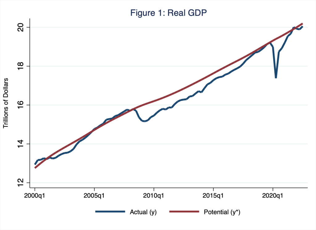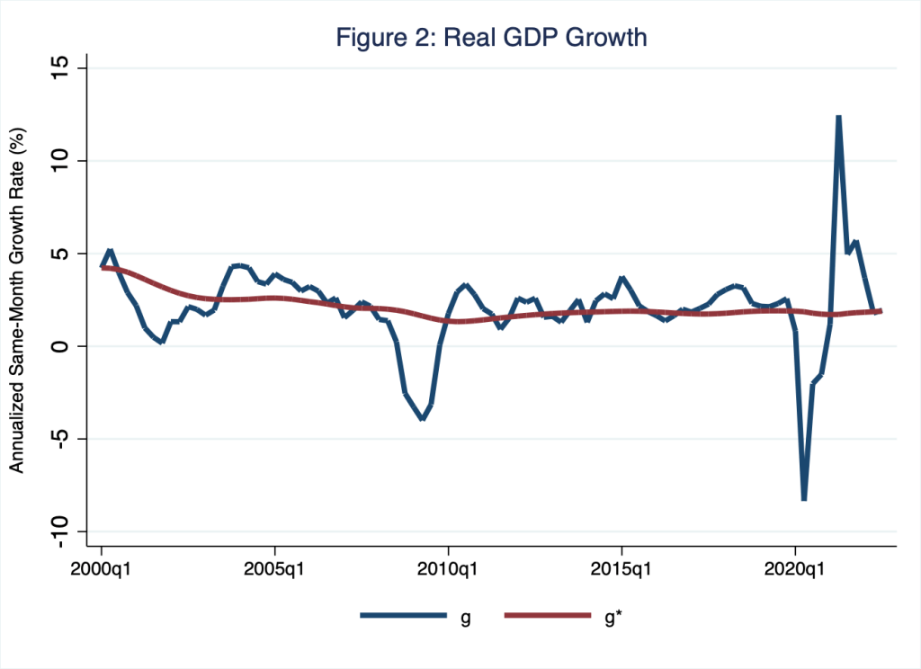 Thus, according to Figure 2, the good news is that U.S. economic growth has reached its potential: this is to say, , because, in the context of Figure 2, as of the third quarter of 2022 the blue and red lines intersect. Nevertheless, the bad news is twofold: first, actual economic growth (