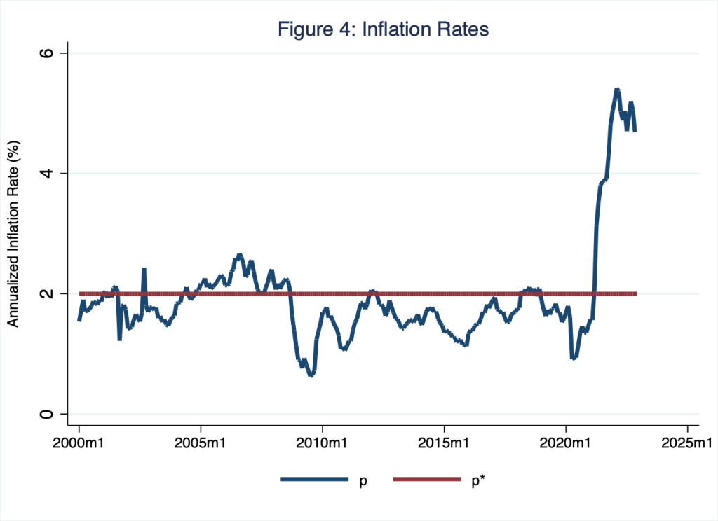 This basic assessment of the general features of a standard, canonical model of a macroeconomy suggests all is not right with the U.S. economy. Moreover, this basic assessment suggests why. The annual percentage change in , the annual rate of inflation, exceeds its target by more than three percentage points; technically speaking, the annual percentage change in