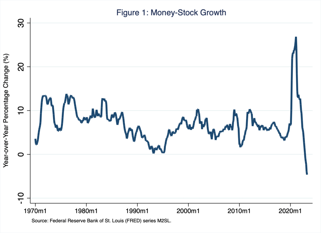 As the measure of the growth of velocity I report in the last row of Table 1 suggests, in the last few quarters—far right side of Figure 3—velocity has risen rather suddenly. In the first quarter of 2023, velocity registered 1.3, roughly equal to the value velocity registered in the first quarter of 2020. In the years leading up to the pandemic, velocity registered about 1.5. Thus, if velocity continues to rise quickly, so that the average quarterly growth rate of velocity—the measure I report in the column labeled “V” of Table 1—remains relatively high, then a shrinking supply of money may not lower the rate of inflation: the rate of inflation could remain elevated because the flow of continues to grow at a relatively high rate even though the growth rate of the supply of money continues to fall.