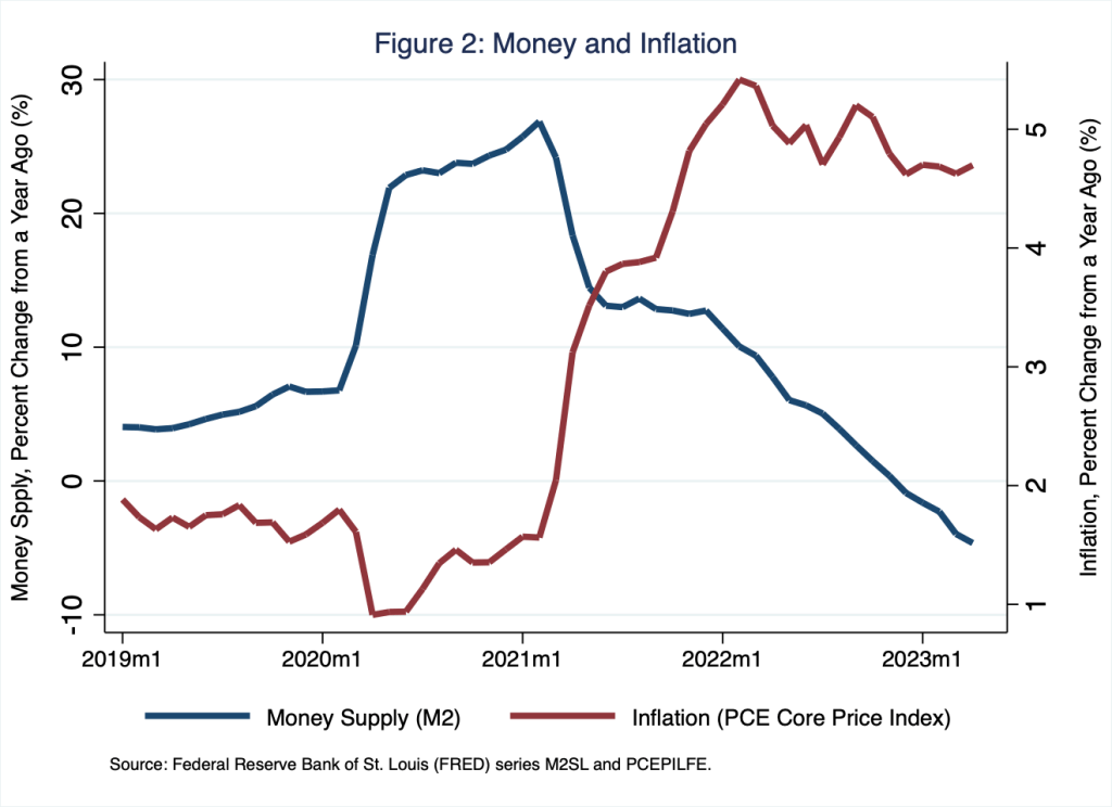 According to Figure 1, the growth of the supply of money during and after the pandemic has been, like every other macroeconomic feature of the pandemic, extraordinary. At no time since 1970, has the supply of money grown as much or as little as it has grown in the last three and half years or so. As I argued in a recent Schooled post, It’s Only Money, although the rates of inflation with which the U.S. and world economies currently contend were instigated, in part, by supply (chain) shocks, inflation is ultimately a monetary phenomenon: the outcome of too much money chasing too few goods—supply-chain constrained or otherwise. To see this relationship between the supply of money and the rate of inflation, consider Figure 2, in which I illustrate the growth in the supply of money—the blue line I illustrate for a longer time period in Figure 1—and the rate of inflation—the red line, based on the personal consumption expenditures core price index—from just before the pandemic to now.