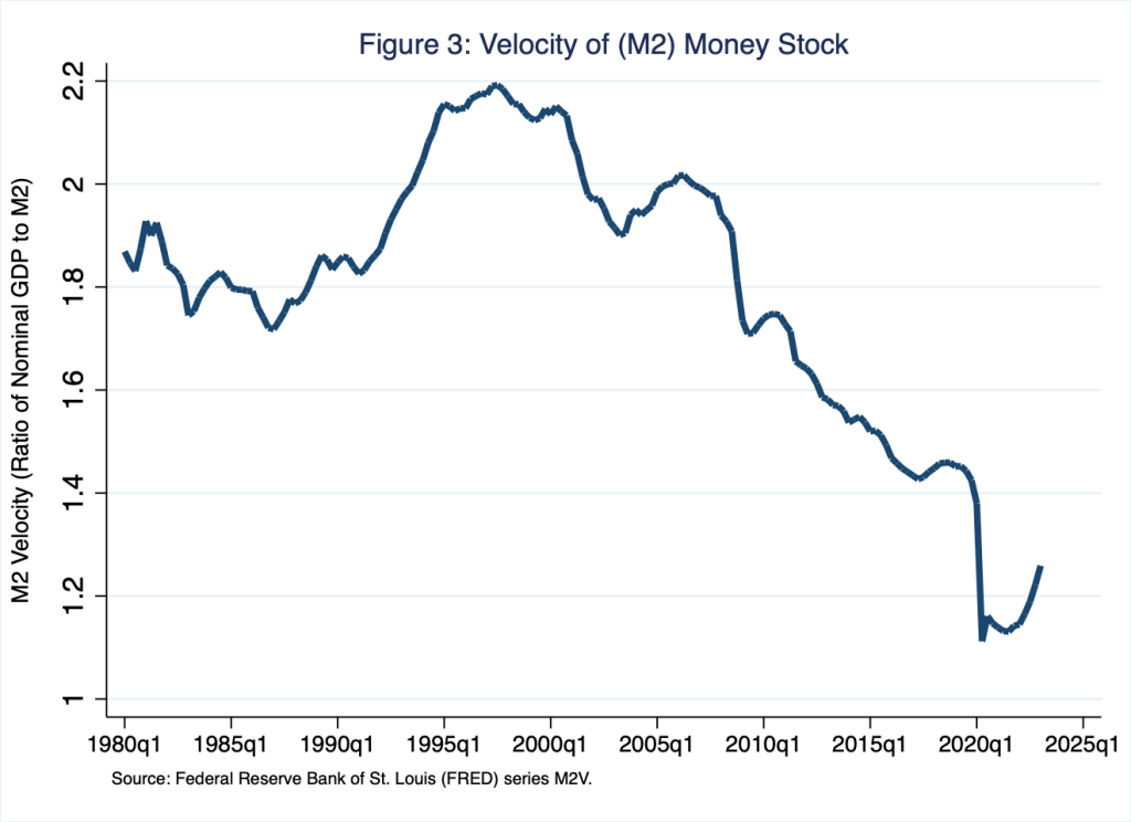 In striking contrast, the last row in the table reveals a very different pattern: for the time period 2021 – 2023 (Q1), the growth rate of the supply of money was relatively low—the lowest measure of money growth in the table—and the rate of inflation was relatively high—the highest measure of inflation in the table. The reason for the disconnect is the relatively high growth of velocity, which registered an average quarterly growth rate of 1.0%—the highest measure of velocity growth in the table. In Figure 3, I illustrate velocity beginning in 1980.