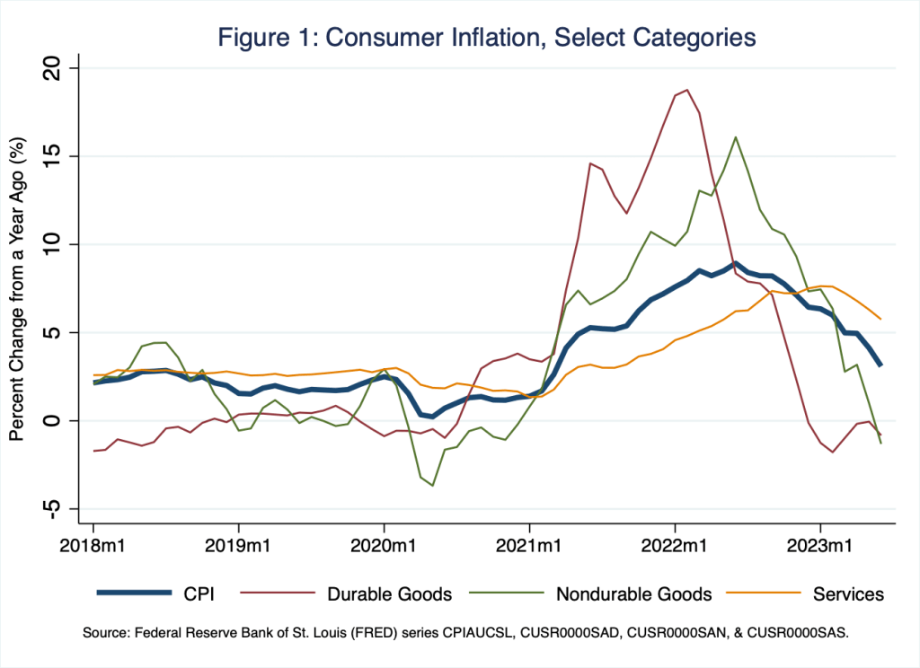According to Figure 1, consumer-price inflation peaked at 8.9 percent in June 2022; it fell to 3.1 percent in June 2023. Meanwhile, growth in the average price levels of durable goods and nondurable goods peaked at 18.8 percent (February, 2022) and 16.1 percent (June 2022), respectively. In any case, core inflation, which I do not illustrate and from which we exclude volatile food and energy components, remains elevated at 4.9 percent (June 2023). We are not out of the woods yet.