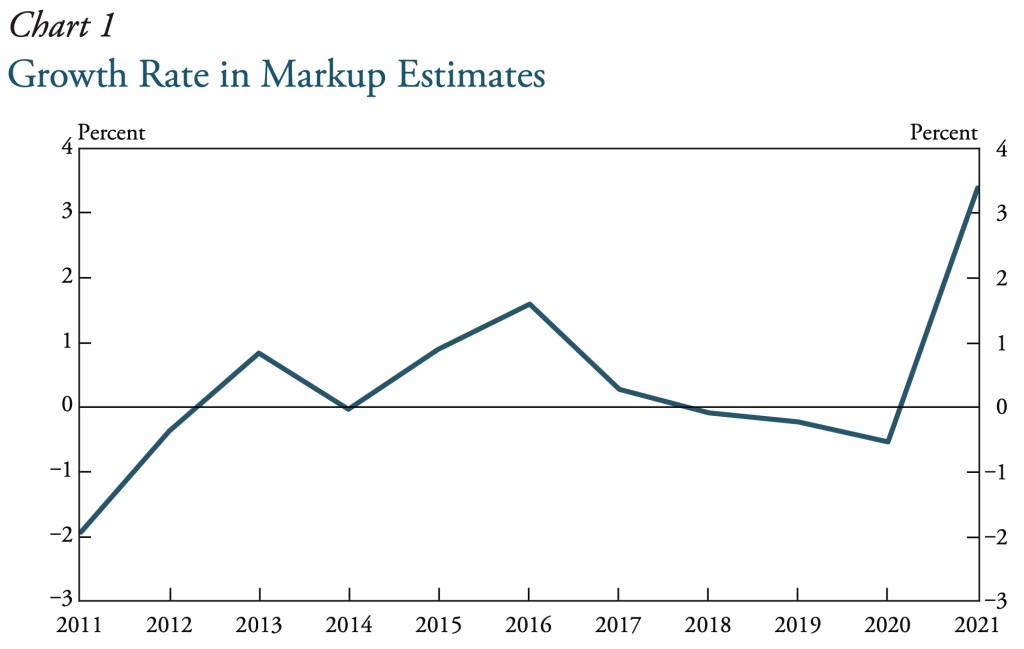 According to Chart 1, average markup growth increased by 3.4 percent in 2021, a time when inflation measured by the Fed’s preferred personal consumption expenditures index increased by 5.8 percent. Thus, a simple—and very likely too simple—interpretation of Chart 1 is the markup explains more than half the inflation in 2021. Greedflation is having its day.