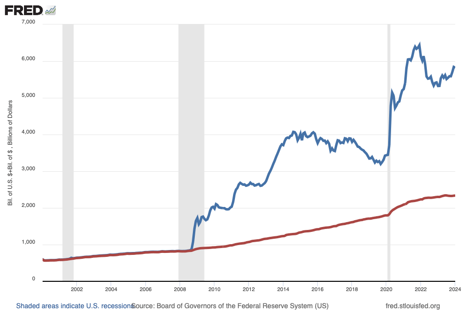 Since the financial crisis in 2008 and to an even greater extent during the pandemic, the Federal Reserve has engaged in unconventional monetary policy, which has dramatically expanded the balance sheet of the central bank. In Figure 5, bank reserves (blue minus red) are barely visible before the Great Recession and the concomitant and unprecedented rise in bank reserves. Meanwhile, the rise in currency in circulation is a gradual, largely uneventful process—altered a bit during the pandemic—and driven by our steady demand for cash, literally. In December 2007, just prior to the Great Recession, the monetary base totaled $827 billion; in January 2024, the monetary base totaled $5.8 trillion, of which $3.5 trillion was comprised of bank reserves.