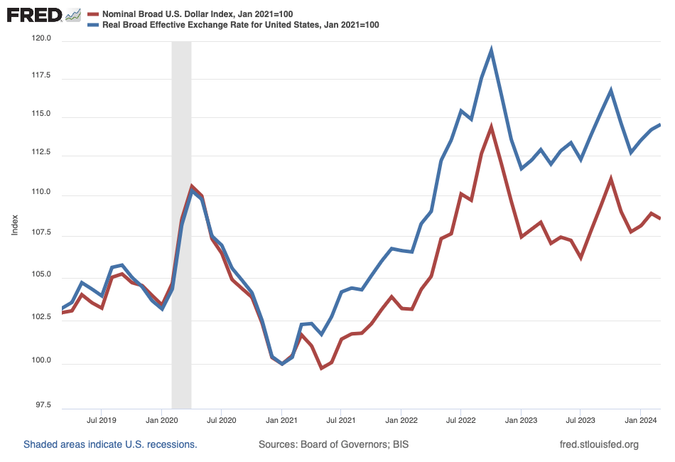 Because exchange rates move quickly over time while average price levels, such as those I illustrate in Figure 2 (in red), move slowly over time, in practice a nominal exchange-rate appreciation implies a real-exchange rate appreciation: when the dollar strengthens in nominal terms relative to other currencies, the dollar strengthens in real terms as well because the average price level in each country takes a relatively long time to adjust. I demonstrate this pattern in Figure 4, in which I illustrate nominal and real foreign-exchange values of the U.S. dollar against a basket of currencies—an average foreign-exchange value of the U.S. dollar, essentially.