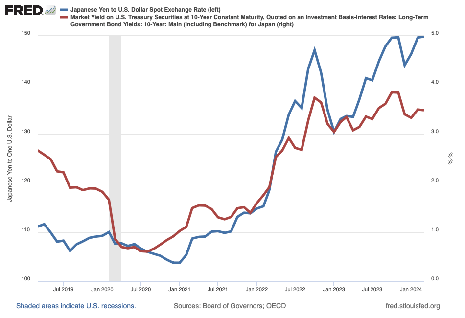 According to Figure 3, the 10-year yield to maturity in the U.S. has risen above its corresponding yield to maturity in Japan, in this case because the Federal Reserve has aggressively tightened monetary policy, while the (central) Bank of Japan has not. Consequently, the yen has depreciated—and, in turn, the dollar has appreciated—so the expected appreciation of the yen compensates investors in the yen for the difference in interest rates in the two countries. This is to say, the yen price of the U.S. dollar is positively correlated with the difference between interest rates in the U.S. and Japan: the blue and red lines in Figure 3 move together. More generally, then, the interest-rate differential—and, thus, the theory of interest-rate parity—essentially explains why the dollar is strong relative to the yen and several other currencies at the moment.