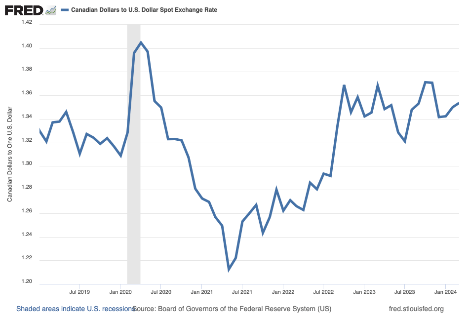 According to Figure 1, the Canadian-dollar price of the US dollar has generally increased over the last three years, an observation we glean from Figure 1 where the exchange rate I illustrate rises from about mid-2021 to the present. Most importantly for the purposes of this blog post and in relation to the Economist article to which I referred earlier, the pound price of the US dollar has risen suddenly and substantially in just the last year or so; and this pattern is typical of other foreign-currency prices of the US dollar as well. For example, the same Economist article reports the Indian rupee, Mexican peso, Chinese yuan, British pound, euro, and Japanese yen have each weakened relative to the U.S. dollar since the start of 2024.