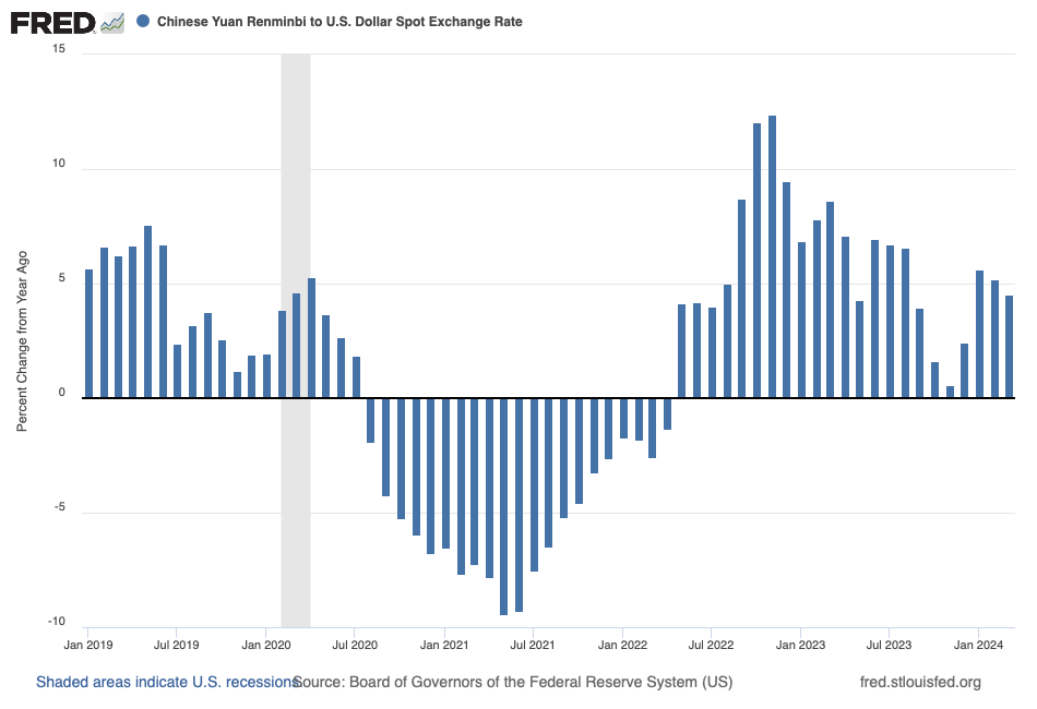 Enter China, the country with which the U.S. maintains its largest trade deficit. The recent strength of the U.S. dollar has occurred relative to the yuan as well. In Figure 5, I illustrate this pattern with a bar chart; the height of each bar measures the year-over-year percentage increase in—think, appreciation of—the U.S. dollar relative to the yuan.