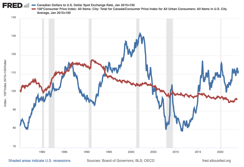 In Figure 2, the pattern the theory of purchasing-power parity implies is evident. This is to say, over the relatively long span of nearly five decades, the nominal exchange rate (blue) reverts to—or, less formally, moves around—the ratio of average price levels (red). To understand why, consider the late 1990s, when the U.S. dollar generally appreciated relative to the Canadian dollar (and so the blue line rose); the appreciation was real, as well as nominal, because the nominal exchange rate rose above the ratio of average price levels: the purchasing power of the U.S. dollar exceeded the purchasing power of the Canadian dollar. In the parlance of international macroeconomics, by the early 2000s, the U.S. dollar was overvalued against the Canadian dollar. The terms of trade incentivized Americans and Canadians to purchase Canadian goods and services, eventually increasing the value of the Canadian dollar and, in doing so, eventually moving the nominal exchange rate back toward the ratio of average price levels—the blue line returned to the red line around 2005—(re)establishing purchasing power parity. Indeed, the theory of purchasing power parity underlies the longstanding Big-Mac Index—based on an internationally homogenous good of two all-beef patties, special sauce, lettuce, cheese, pickles, and onions on a sesame-seed bun—that the The Economist magazine introduced in 1986 as a (lighthearted) measure of exchange-rate purchasing-power parity.