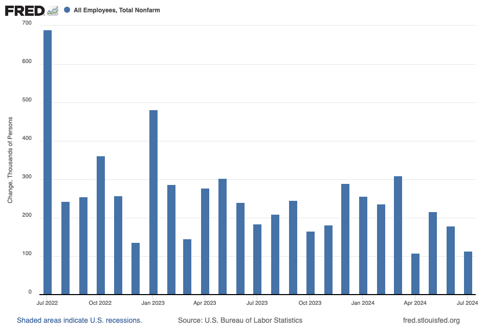 On Friday, the U.S. Bureau of Labor Statistics (BLS) reported the U.S. economy added 114,000 jobs (on net) in July. In Figure 1, I illustrate the number of jobs created in the U.S. economy each month since July 2022; to be sure, compared to the number of jobs created over the last few years, the number registered in July was relatively—though not exceptionally—low. On balance, macroeconomists expected the economy to create about 175,000 in July.