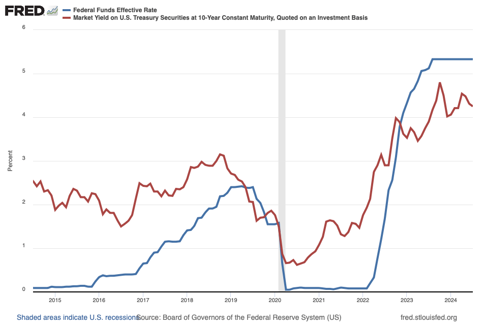 At any moment, the federal funds rate reflects the so-called stance of monetary policy: expansionary—and a relatively low federal funds rate—if output is below potential or inflation is below the two-percent target rate; or contractionary—and a relatively high federal funds rate—if output is above potential or inflation is above the two-percent rate. Currently, the stance is presumably contractionary—think, tight monetary policy—because inflation remains elevated, though much less so than during 2022 and 2023. Over the last 24 months, the central bank has raised the federal funds rate from 0 to 0.25 percent to 5.25 to 5.50 percent.