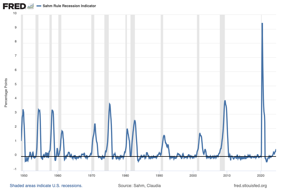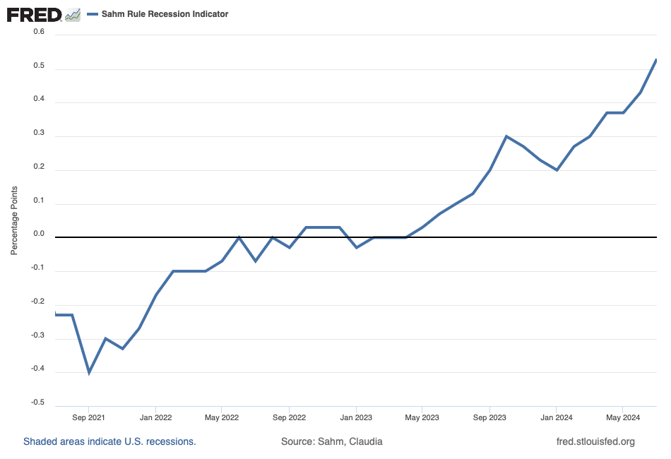 According to Figure 4, each time the Sahm-rule indicator exceeded the half of one percentage point threshold, a business-cycle recession (indicated by a gray, vertical bar) soon followed. Moreover, throughout the Post-WWII era illustrated in Figure 4, the Sahm rule essentially never produced a false positive: this is to say, the rule never registered a value above 0.5 without a recession following immediately or very soon thereafter. In Figure 4, the most recent data point corresponds to a Sahm-rule indicator of 0.53 for July, 2024. In Figure 5, I illustrate the Sahm-rule indicator beginning July 2021, thereby emphasizing the recent rise in the indicator above 0.5.