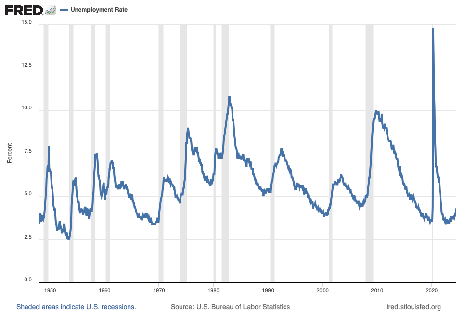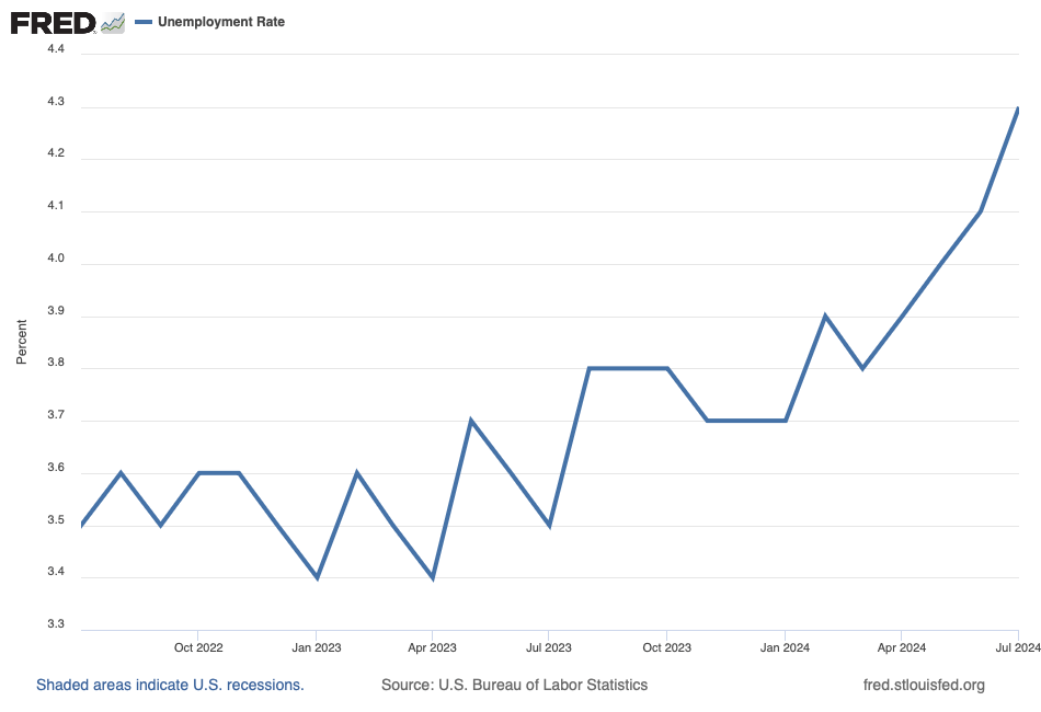 According to Figure 3, the unemployment rate rose from 3.8 percent in March 2024 to 4.3 percent in July 2024, a fifty-basis-point increase in the rate in four months. Understandably, many macroeconomists have grown alarmed by the recent pattern of deterioration in the labor market.