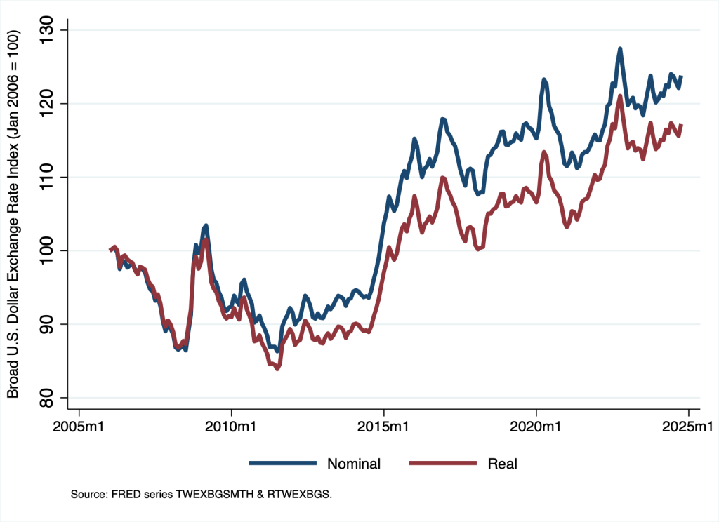 The crucial takeaway from the analysis of patterns of expenditures between the United States and the rest the world is that the trade balance is very largely determined by (domestic) national saving and domestic investment, features of a macroeconomy over which the rest of the world has relatively little, if any, control. A positive trade balance exists for the United States if national saving exceeds domestic investment and, thus, on balance, households, firms, and governments in the United States sell goods and services to the rest of the world; in this case, the foreign-exchange value of the U.S. dollar falls to clear the international market for goods and services and U.S. investors purchase foreign assets. Similarly, a negative trade balance exists for the United States if national saving falls short of domestic investment and, thus, on balance, households, firms, and governments sell goods and services to the US; in this case, the foreign-exchange value of the U.S. dollar rises to clear the international market for goods and services and investors abroad purchase assets in the United States. The pattern of a rising foreign-exchange value of the U.S. dollar amid U.S. trade deficits is visible in Figure 5, which we should view as a consequence instead of as a cause of U.S. trade deficits caused by national saving falling short of domestic investment.