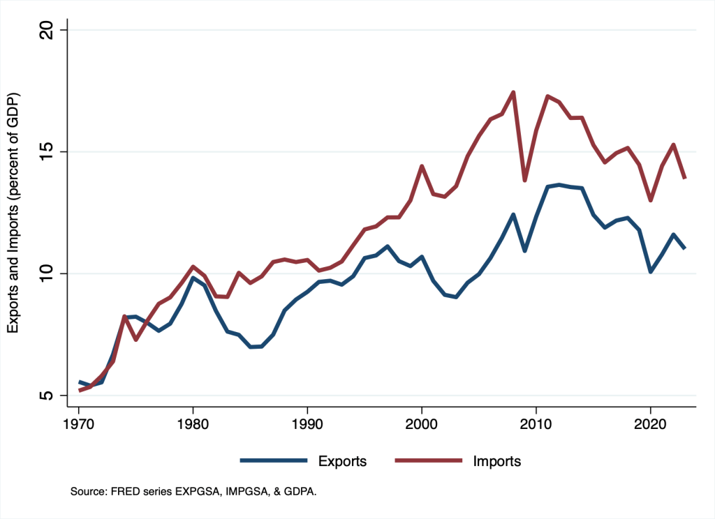 According to Figure 2, in 1970, exports and imports measured, respectively, 5.6 percent and 5.2 percent of GDP; in 2008, the shares peaked at 12.4 and 17.4; and in 2023 (the last year for which annual data are available), the shares measured 11 and 13.9 percent of GDP. Thus, measured as the sum of exports and imports, trade of goods and services between the United States and the rest of the world rose from 10.8 percent (5.6 percent plus 5.2 percent) of GDP in 1970—about the same share the United States economy recorded forty years earlier—to 24.9 percent of GDP today. Nevertheless, compared to the rest of the world, the United States remains a relatively closed economy. According to the World Bank, in 2023, the world average sum of country exports and imports as a share of same-country GDP measured 63 percent; the lowest share (of 2 percent) belonged to Sudan, and the highest share (of 394 percent) belonged to Luxembourg. The comparable 2023 shares for, say, Canada and Mexico measured 67 percent and 74 percent, respectively.