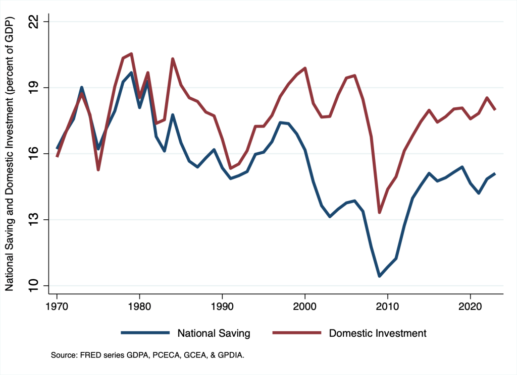 At any moment in time along the x-axis in Figure 4, net exports as a share of GDP (illustrated in Figure 3) is measured as the vertical distance of the gap between the blue and red lines. For example, according to Figure 4, in 2023, national saving as a share of GDP registered 15.1 percent; the measure is indicated by the rightmost data point on the blue line in Figure 4. Meanwhile, domestic investment as a share of GDP registered 18 percent; the measure is indicated by the rightmost data point on the red line in Figure 4. The difference between the two measures is 2.9 percent, which is the trade deficit as a share of GDP in 2023—the measure indicated by the rightmost data point illustrated in Figure 3.